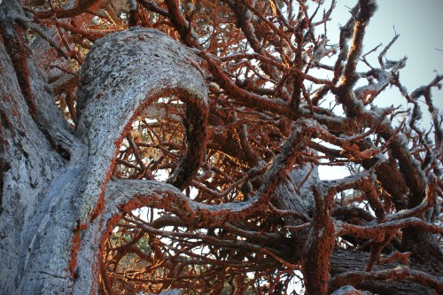 Orange color on the trees is from carotene, a pigment involved in the photosynthetic process of green algae.