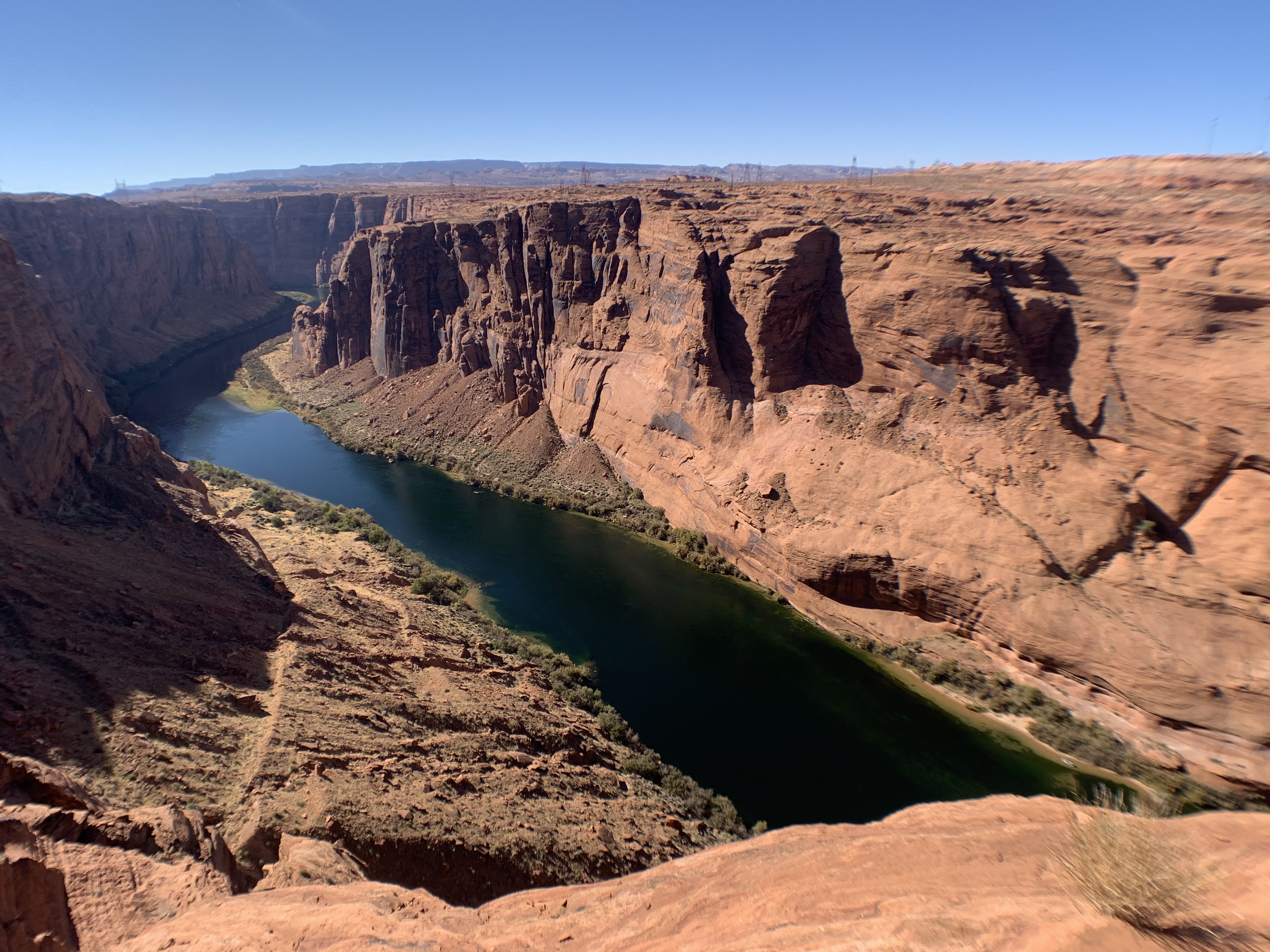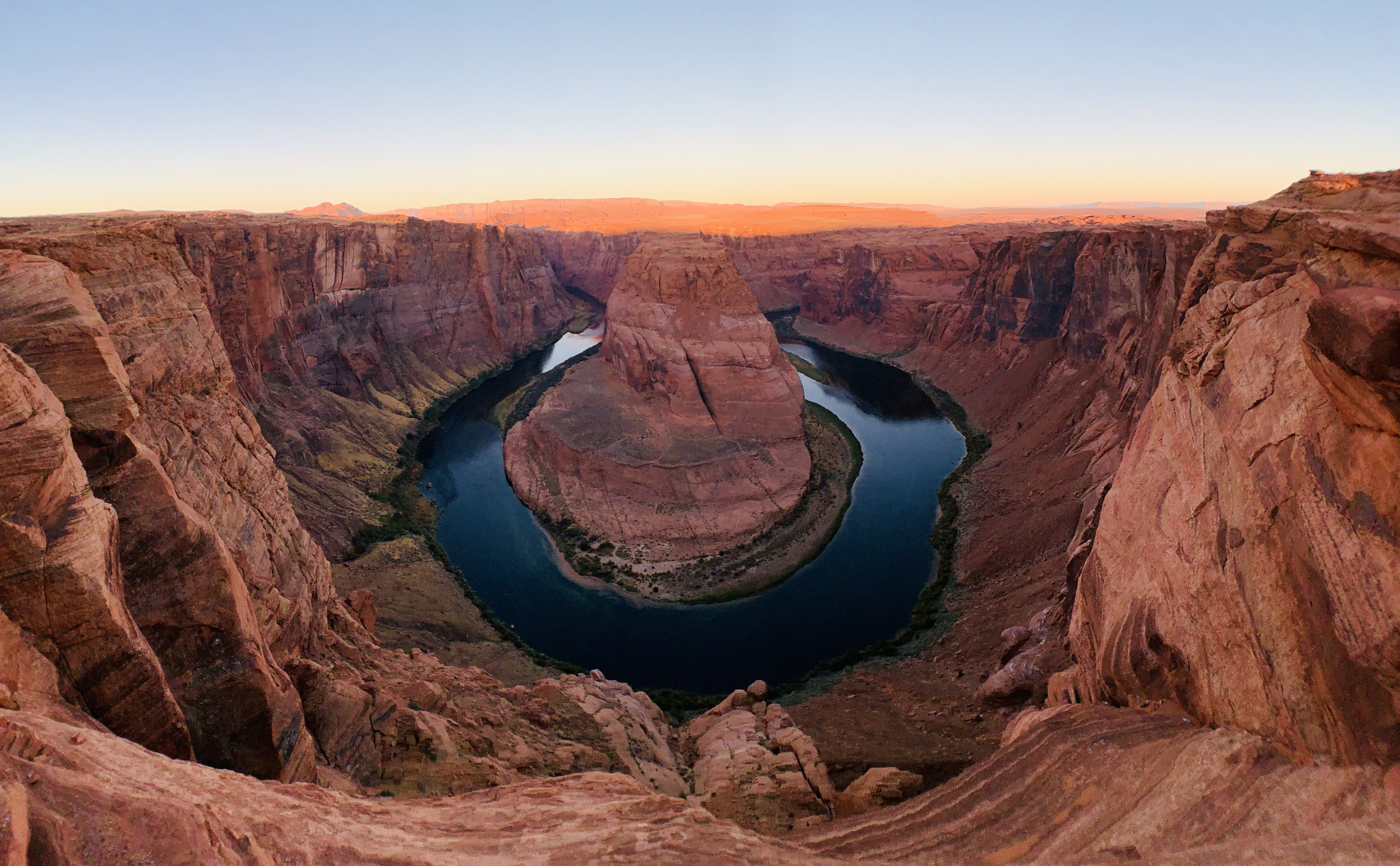 Very slowly, almost imperceptibly, a ribbon of orange is illuminated at the horizon line as the sun begins to awaken behind us. As the ribbon widens, crawling toward us along the ground, a shade of powder blue gradually extends upward from where the ground meets the sky, drowning out the starlight with daylight. For six hours, I stand there, walking along the ledge as shades of pink and orange and purple evolve along the ground accompanied overhead by blues and yellows. The Colorado River becomes more visible, defined as the sun rises and exposes its contours. And for hours, I watch the colors change, the people come and go, two tiny kayakers braving the river. A woman with panda drums carries out a live meditation on one of the rocky overlooks. A goldendoodle named Hazel comes to say hello. But most of my time is spent staring at the riverbend as shadows waltz along the walls of the canyon.