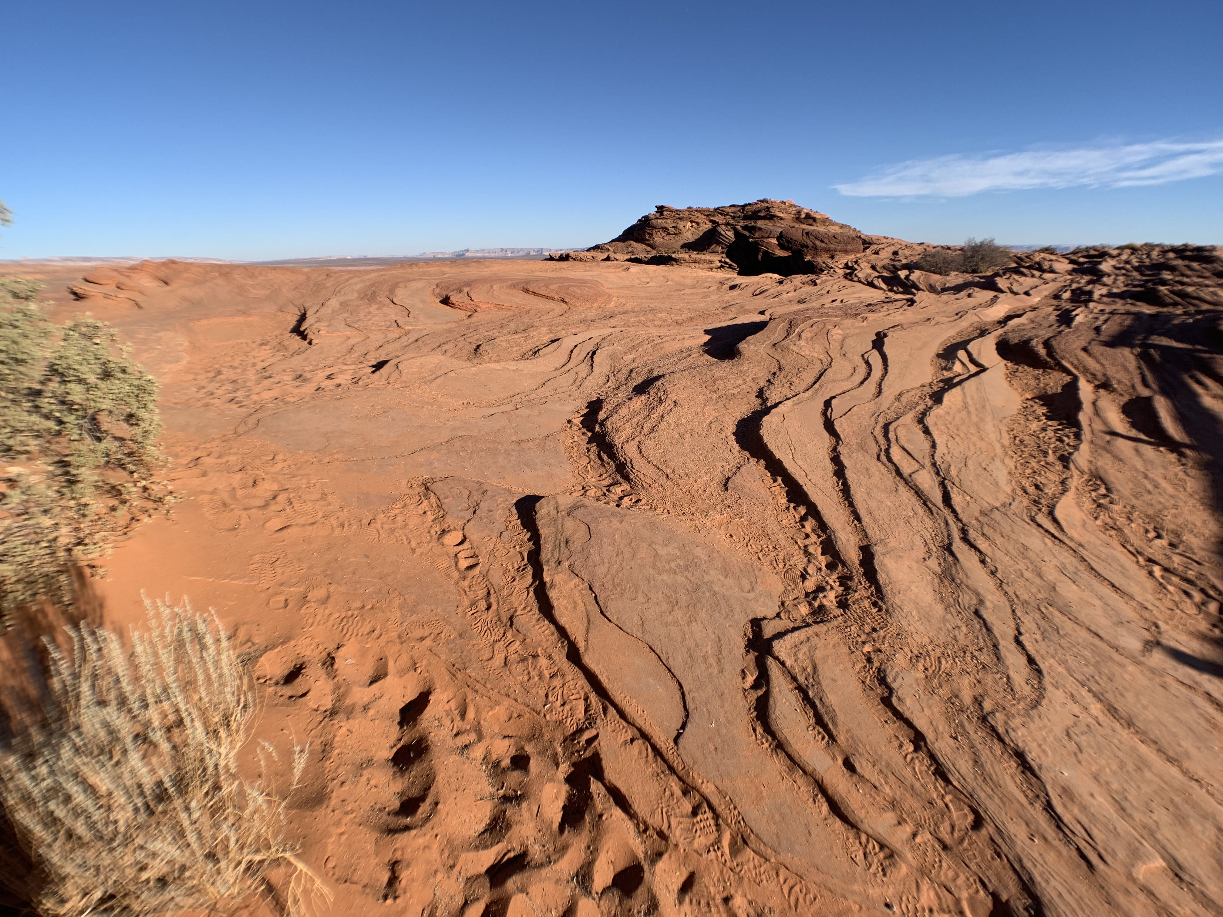 Hundreds of photos later, I hike back to my car in the warm sunshine. The sky is screaming blue, the earth is vibrant orange. The land around the bend is flat overall, but with small ripples as if a wavy water surface has been petrified. My stomach is grumbling with hunger, so I sit in my car and eat my lunch – A turkey wrap, granola bar, and apple. I drink some water and remember the name of a sweet coffee shop I had read about the night before that I think is nearby on North Navajo Drive. Coffee sounds like an excellent decision right about now. I turn the ignition, then I turn left out of the Horseshoe Bend parking lot, following signs toward downtown Page. I twist through unfamiliar roads until I find North Navajo Drive. As I continue along, I come upon a small strip mall and see the sign: LP Espresso! I park, secure my mask on my face, and walk inside. The spacious café has an eclectic atmosphere, with beautiful artwork along the walls featuring the same orange earth – blue sky dichotomy that I spent time enjoying this morning combined with quirky word art. I order a vanilla latte and almond croissant, then scoot back outside into the sunshine.