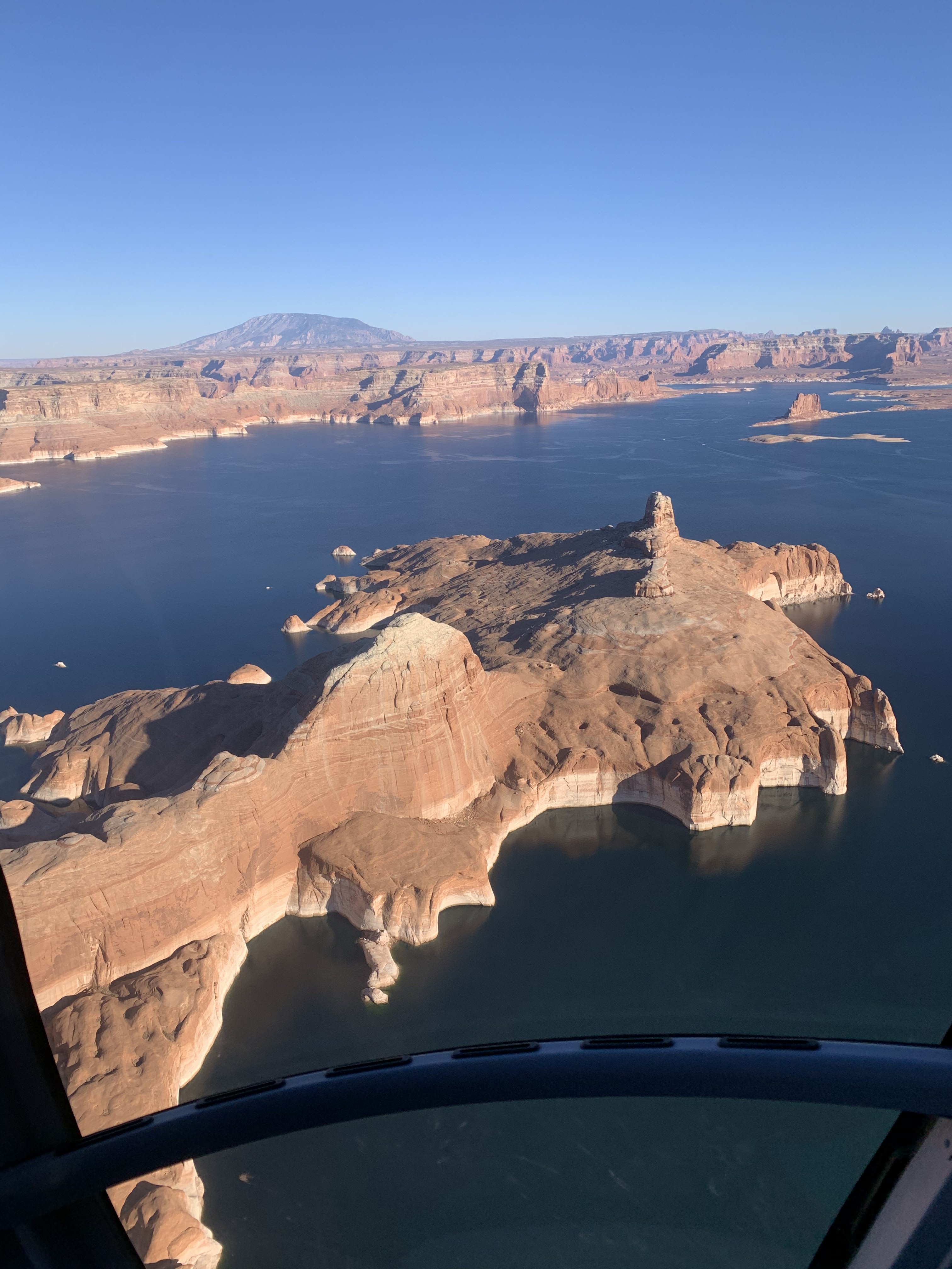 I am one of three scheduled passengers sharing a six-seat helicopter for a 20 minute ride over Lake Powell this afternoon. An orientation video plays, reviewing the safety specifications for the helicopter, and I cannot believe I am about to ride in one. I meet the pilot and the two other passengers, and we get situated, spaced out and strapped in the helicopter. I am in the front, feet from the outside, feeling as if I am in a bubble that is getting ready to fly. We start to rise from the ground and everything feels weightless.
