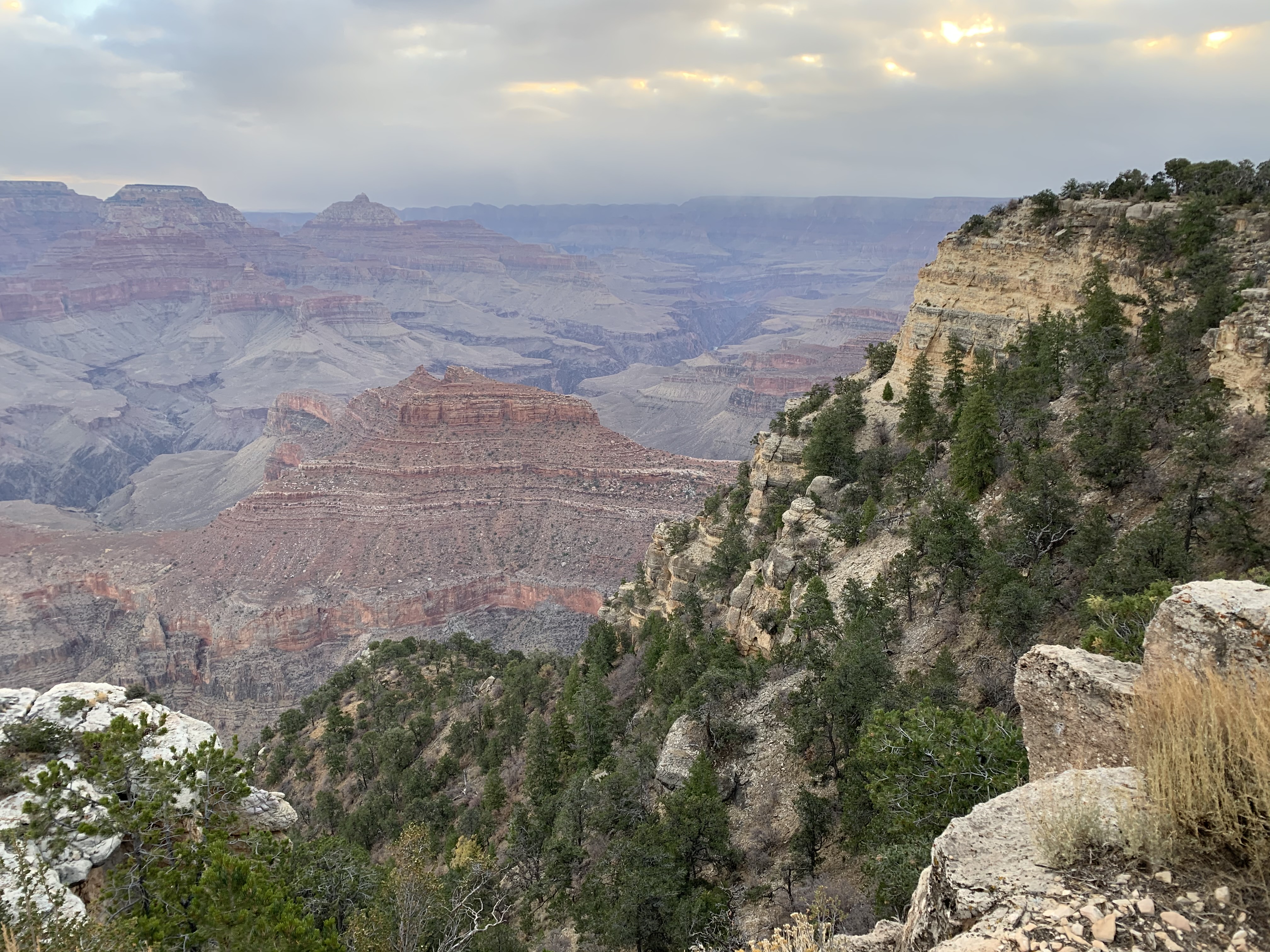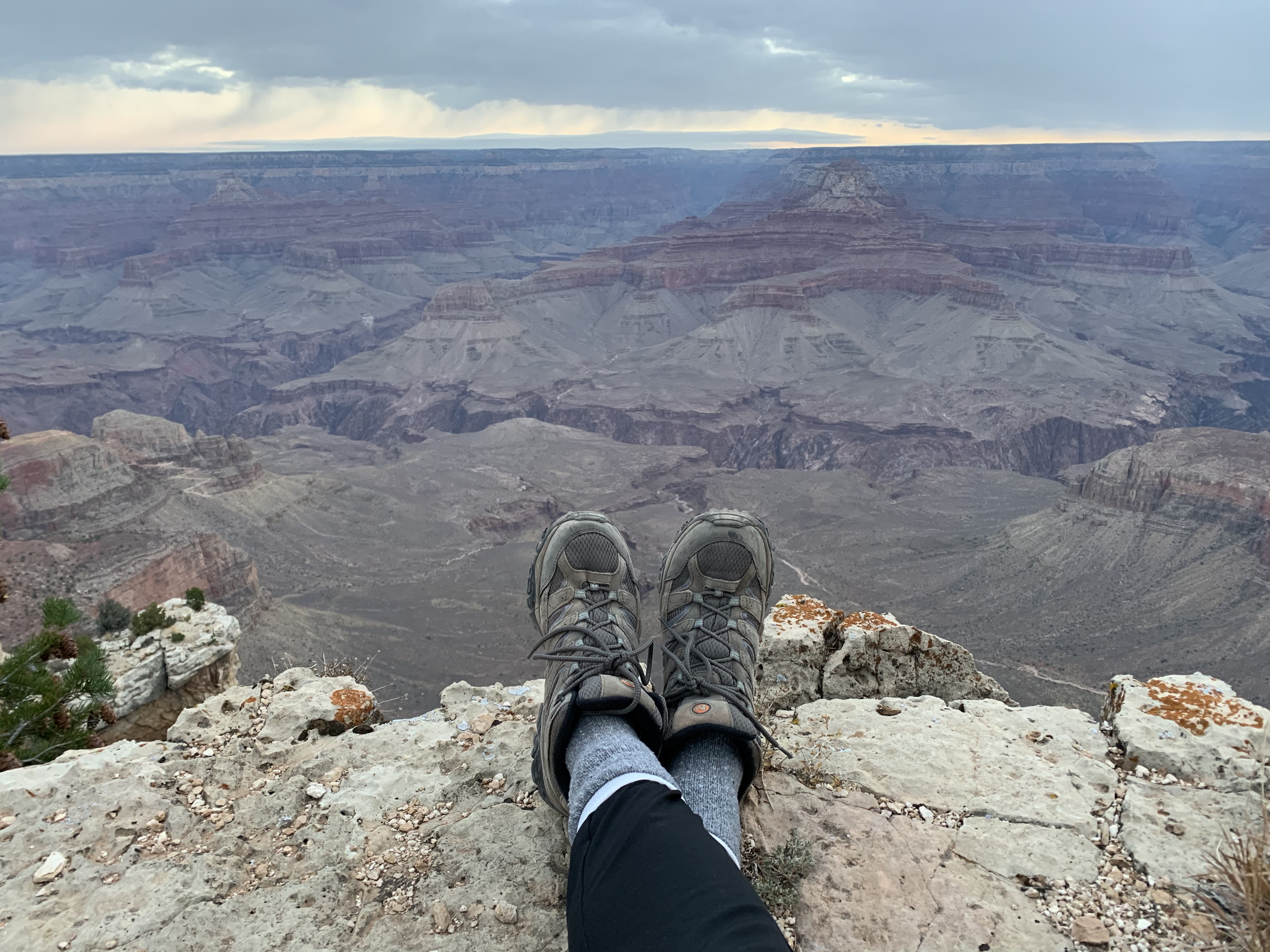 The sun rises over an eastward ridge, still concealed by clouds, but casting bright rays over the vast canyon. The clouds slowly break open, allowing even more light to pour into the shadows. The tippy-tops of each peak are painted with orange and pink, vibrant color that floats along the canyon as the clouds pass over. Birds fly freely and bravely overhead, singing and playing and bringing joy just by existing. This canyon, this deep and wide space of uncertainty and discovery and beauty, feels like a familiar friend. I feel very much at-home.