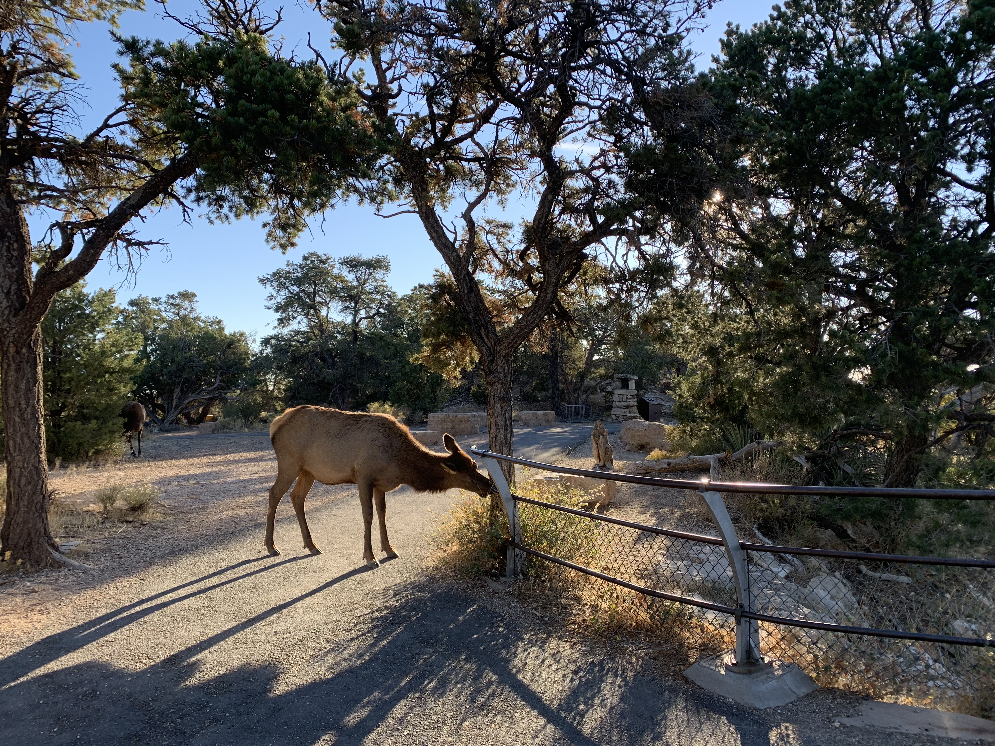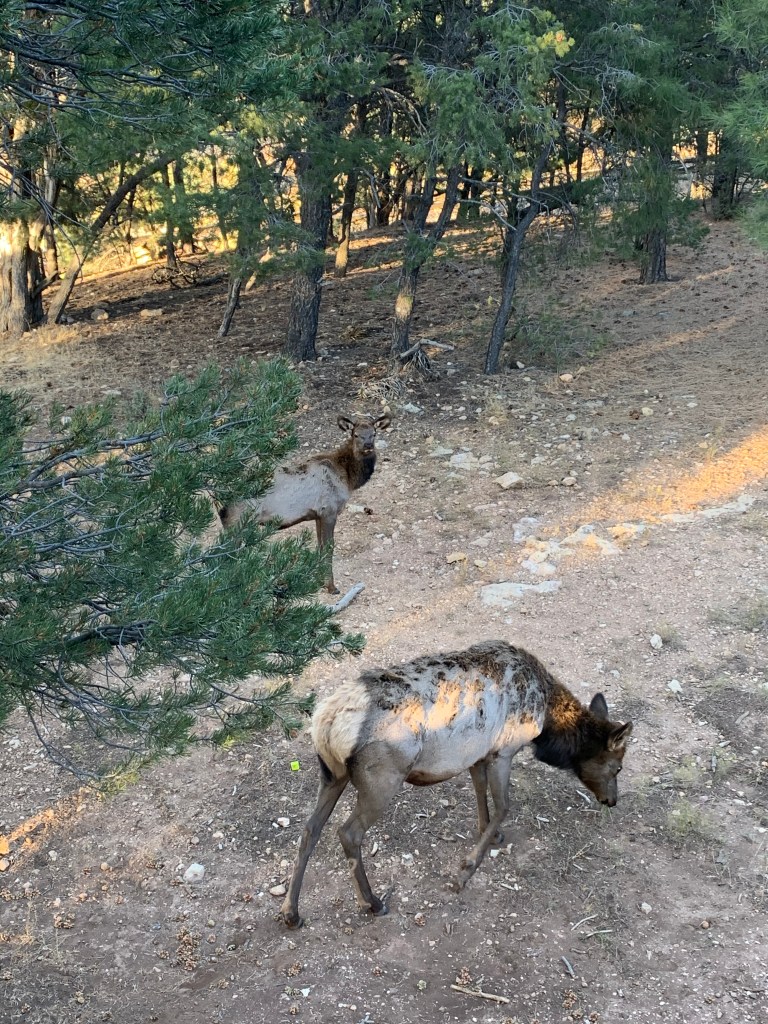 I layer back up and walk slowly, gingerly back to my motel. I change into fresh clothes, check in with my energy and my body, and discover I have more adventure in the tank today. I pack some food (I ended up grocery shopping before my trip and just bringing all my food with me in my checked luggage) and make my way to the Red Route shuttle bus stop, which is back near where the Bright Angel Trailhead is situated. I take the bus west from the village, stopping at overlooks along the southwest rim of the park, similar to how I journeyed along the easternmost overlooks yesterday. I get off the shuttle at Trailview Overlook, Powell Point, Mohave Point, Pima Point, and finally at Hermit’s Rest where I am met by two sweet elk. I wander along this westmost stop along the South Rim and see a salient psalm imprinted on a plaque overlooking the canyon: Sing to God, Sing praises to His name; Lift up a song to Him. Psalm 68:4. That is all my heart can do – Sing. And I thank Him again and again for reviving this heart-song that was once extinguished.