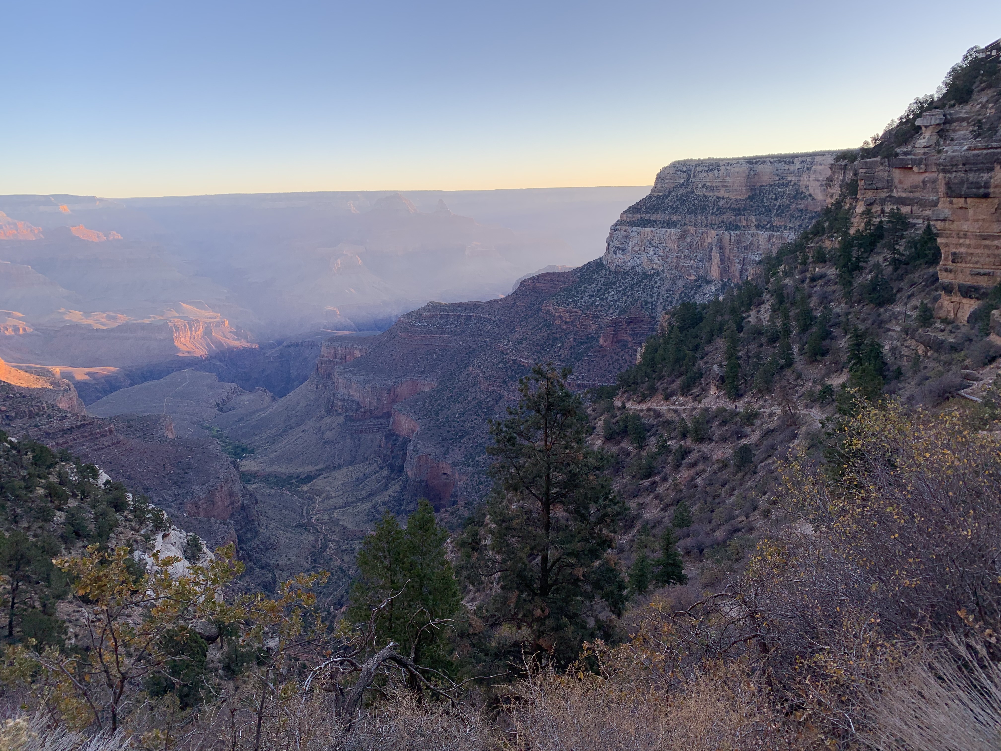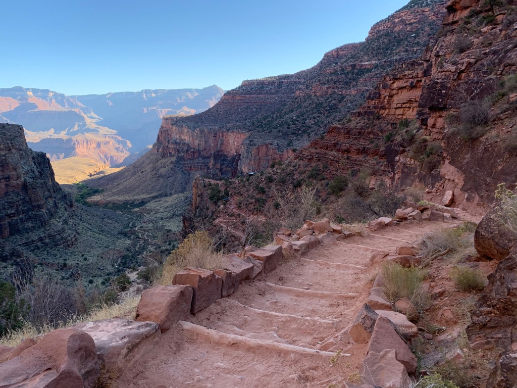 It is 7AM, around 25 degrees Fahrenheit at the South Rim, and I am daunted but energized. I also find myself layered to marshmallow status, anticipating wind and cold as I descend. My trekking poles (aka – life-savers) are ready to go. The sun is rising behind the rim across a nearly cloudless sky, and I am ready to take on the trail. I hear it is moderate-difficulty, steep in some places. And of course, they say “the descent is optional, the ascent thereafter is mandatory, and the latter is the most difficult part”. A couple of other hikers have started ahead of me; I can see them becoming smaller and smaller as they weave on the switchbacks below. What a perfect morning for an adventure.