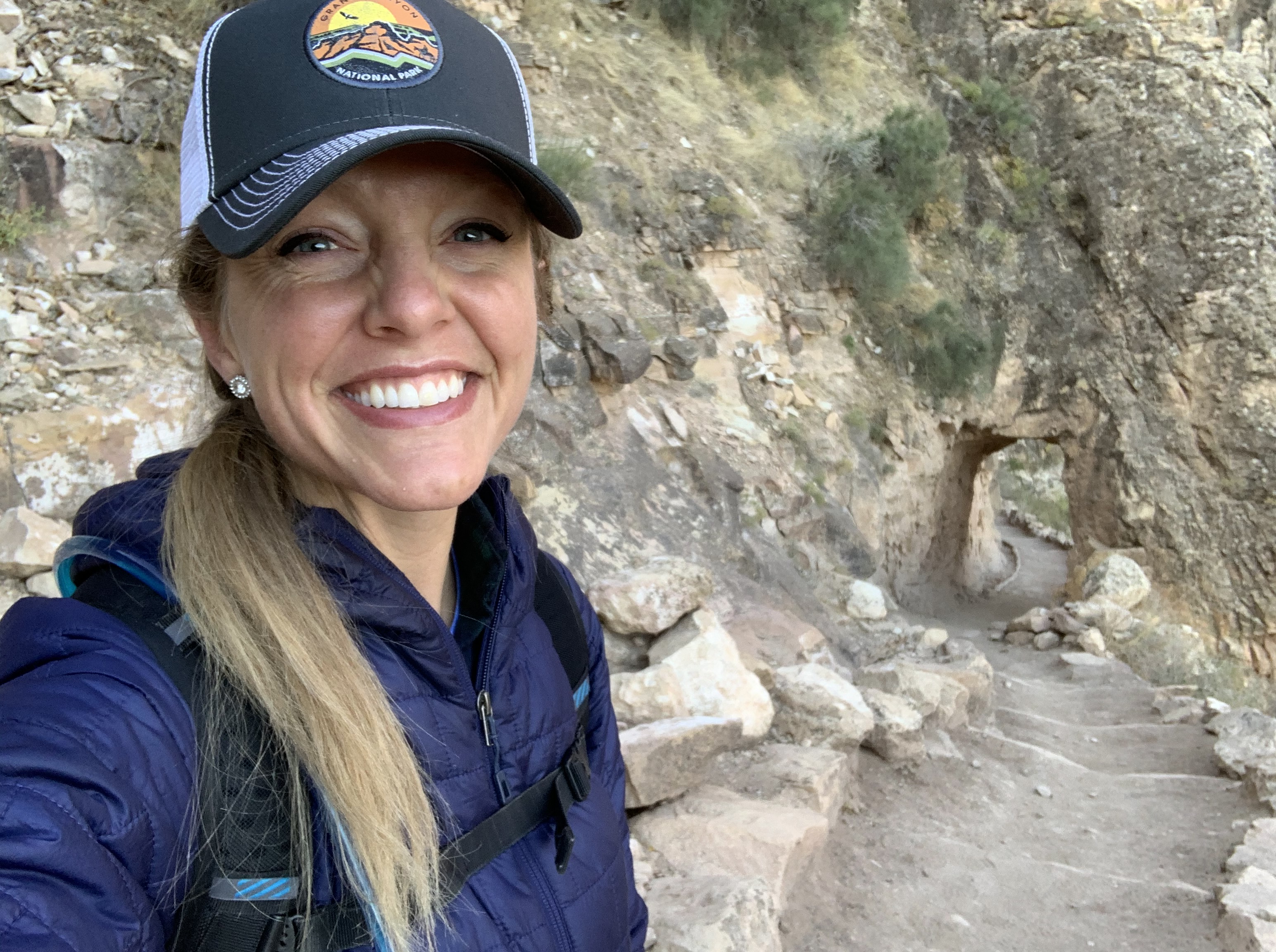 I hike some of the way with Caroline, Daniel, and Luke. Eventually, Luke moves ahead of the three of us. A little later on, I climb ahead and weather the path on my own for a ways. I encounter a man from Florida who had hiked as far as the 1.5-mile rest stop, and we hike upward from there together, sharing about our homes and what we are doing at the canyon. We visit, and then he moves ahead with a friendly “Good luck finishing your hike, Minnesota! You’re almost to the top!” I manage a “Thank you; likewise Florida!”, despite being very out of breath at this point. The tunnels along the path come into view, a welcome sight, as I heave for air and put every mental and physical effort into keeping my arms and legs moving. I am still in my tank top, dripping sweat despite the return to approximate freezing temperatures. Where a small bird flitted ahead of me this morning, a squirrel meets me on the path and hikes a distance with me. The remaining 0.2 miles of trail I traverse on my own. A sense of gratitude and completion takes over. My legs hurt, my knee is rather angry, and my heart is beating a mile a minute. But it feels amazing.