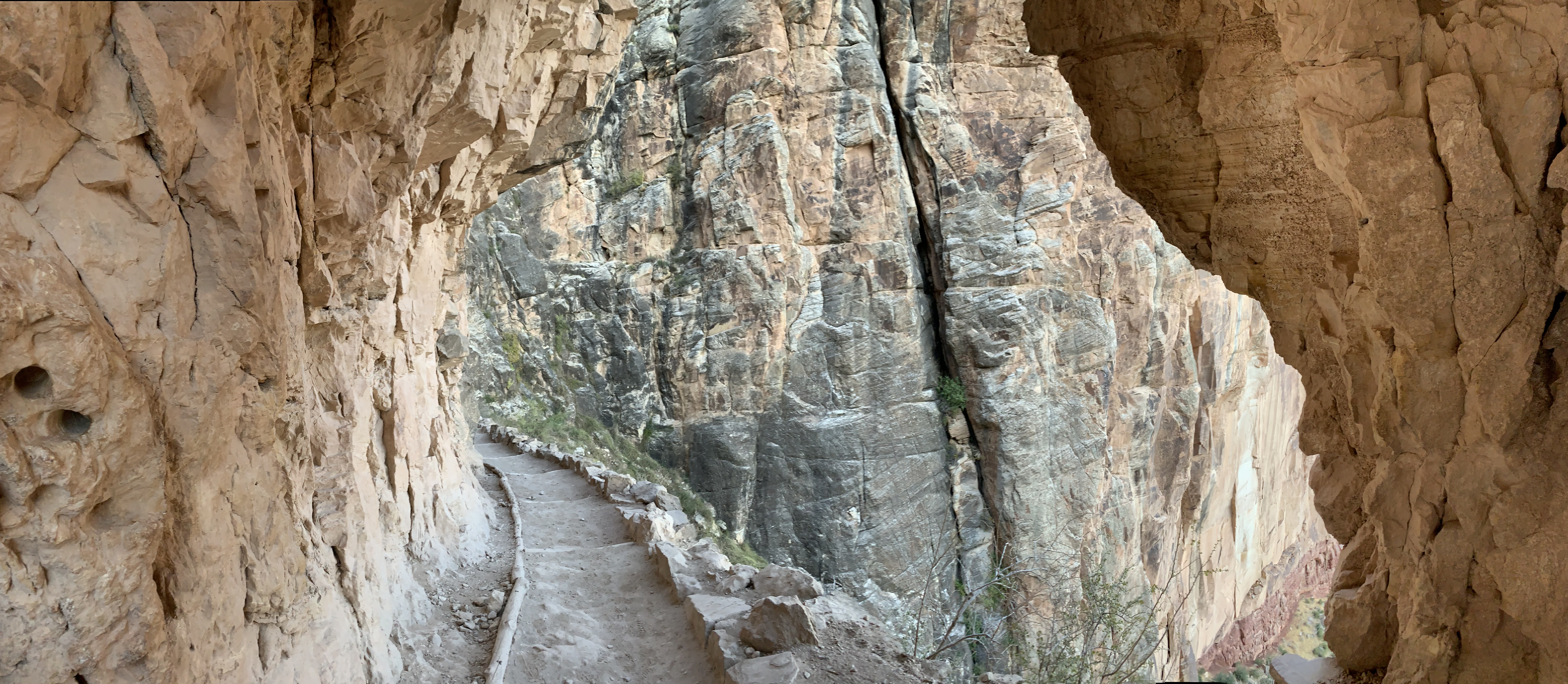 The first mile is relatively level, just a subtle, switch-backing descent. The air is more calm and still than the past two days, much less wind; cool, but refreshing. As I hike, a small bird jumps happily, little by little, along the path ahead of me for around a tenth of a mile. Two short, rocky tunnels arch beautifully over the path within the first mile of trail. I stop to take pictures, and allow a foursome behind me to pass by. We exchange hellos and they continue on. Little did we know we’d develop a sweet trail family by the end of the day.