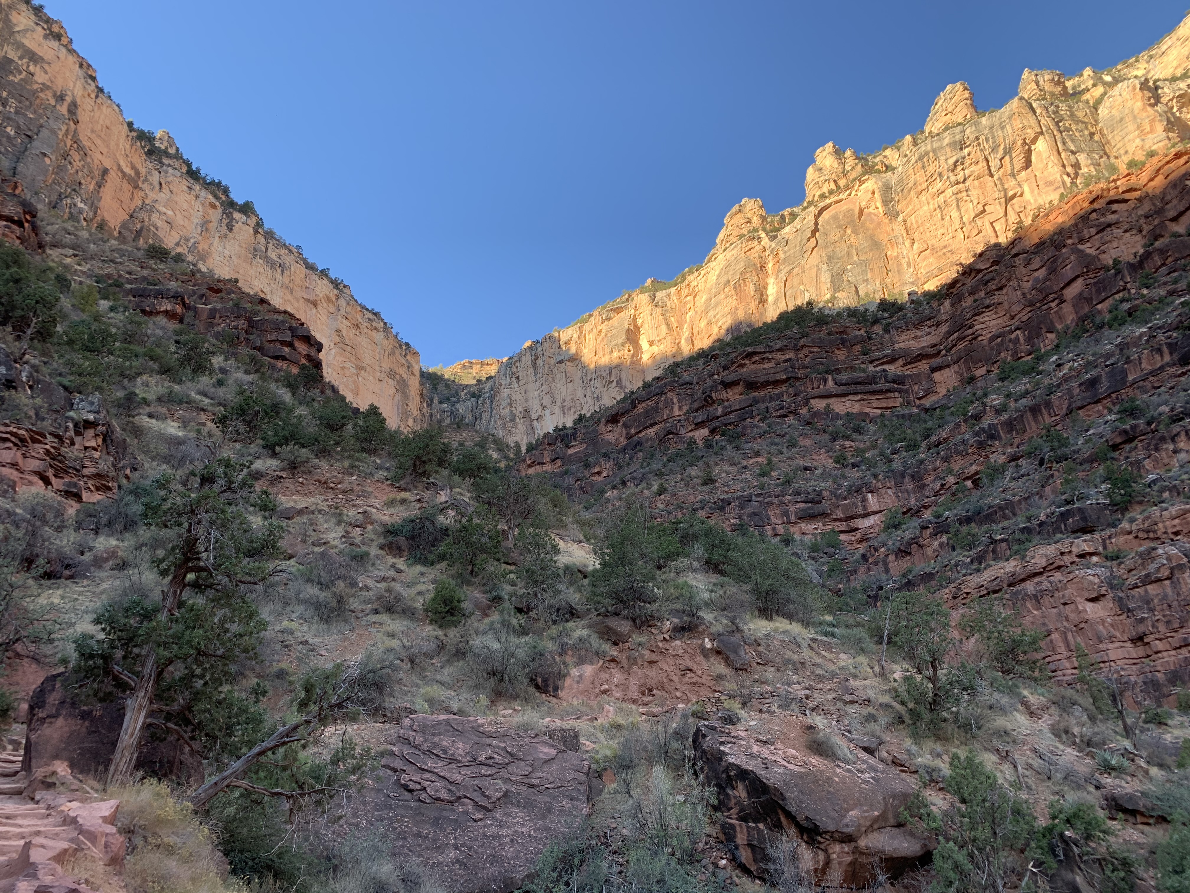 I take in the canyon from where I stand below the rim. The sun hasn’t yet risen over the rim’s edge, but it is spilling light over the desert-land that I am descending toward. The walls of the canyon to my left are imposing. I crane my neck to see the edge above. These sights are other-worldly. I think about how awe-inspiring this vast space of creation is. I think about how awe-inspiring the heart of our Creator is. With the canyon walls surrounding and enveloping me, this hike feels like a hug directly from above.