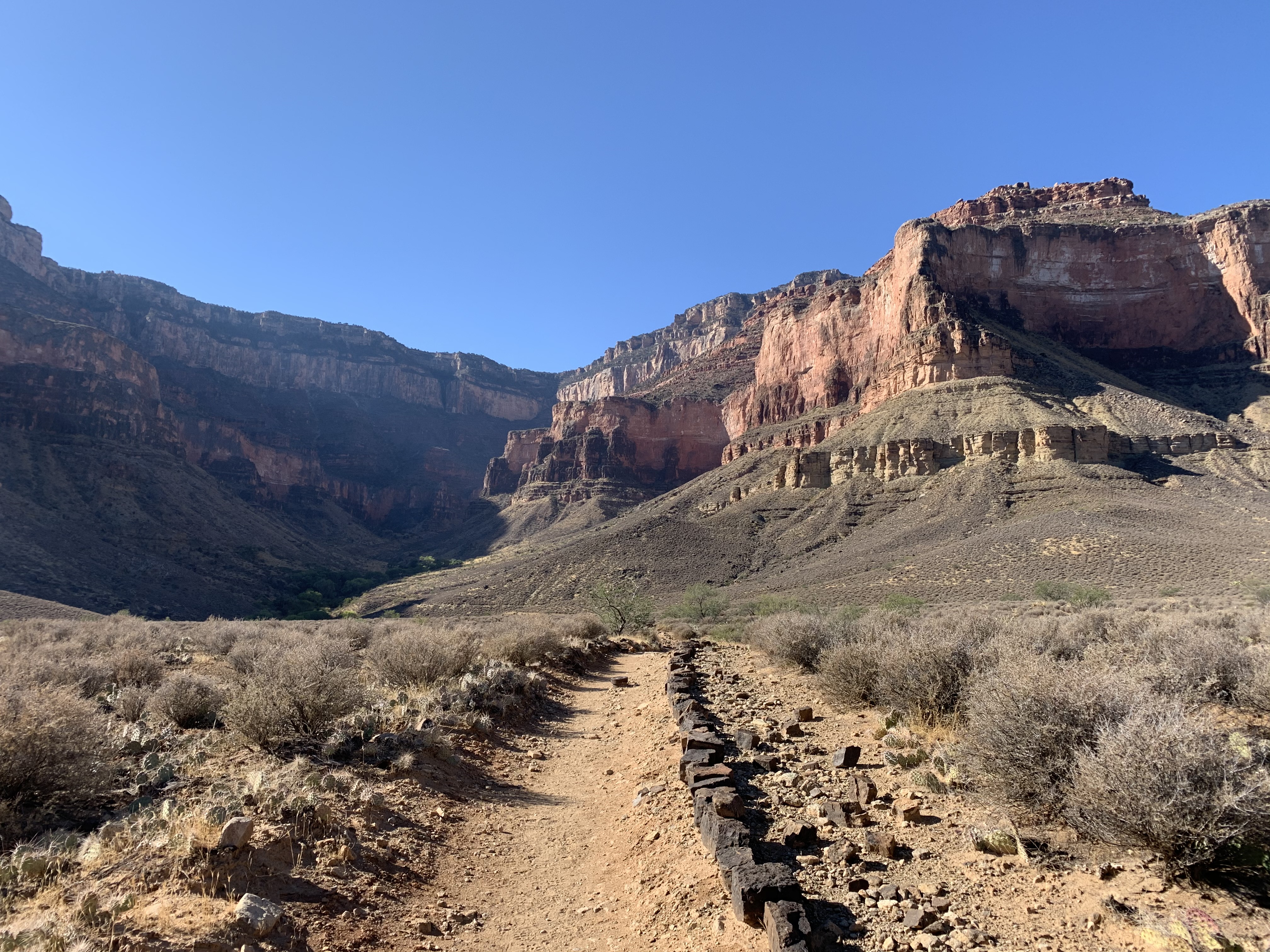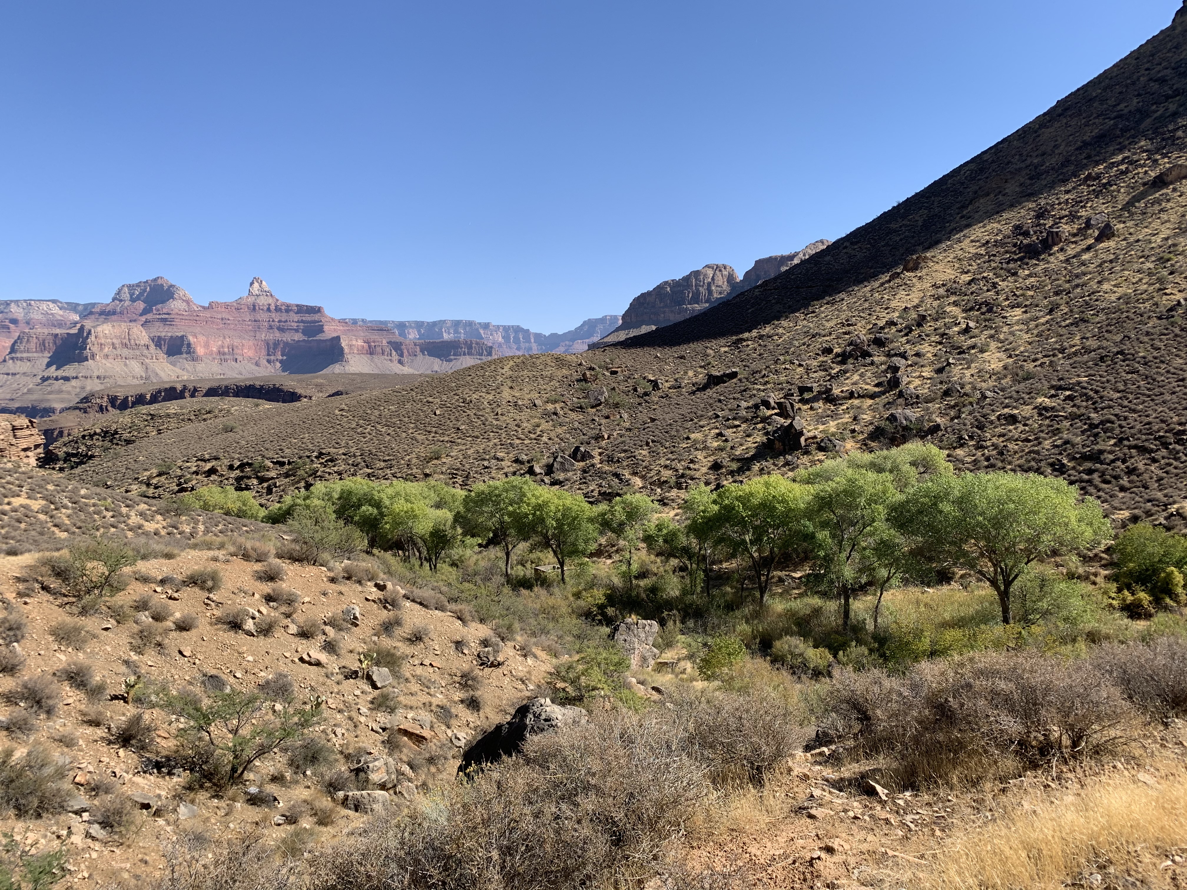 I stop briefly at the 3-mile rest stop, taking in the views, and removing some layers. It has warmed by about 25 degrees at this point, and feels even warmer still given the pace so far this morning. As the journey continues, I find myself intermittently falling behind and then venturing ahead of my fellow hikers that morning, laughing and saying hello or exchanging a joke with each passing by. More photos, and on I go, reaching Indian Gardens – the 4.5-mile point – at around 9:00 AM.