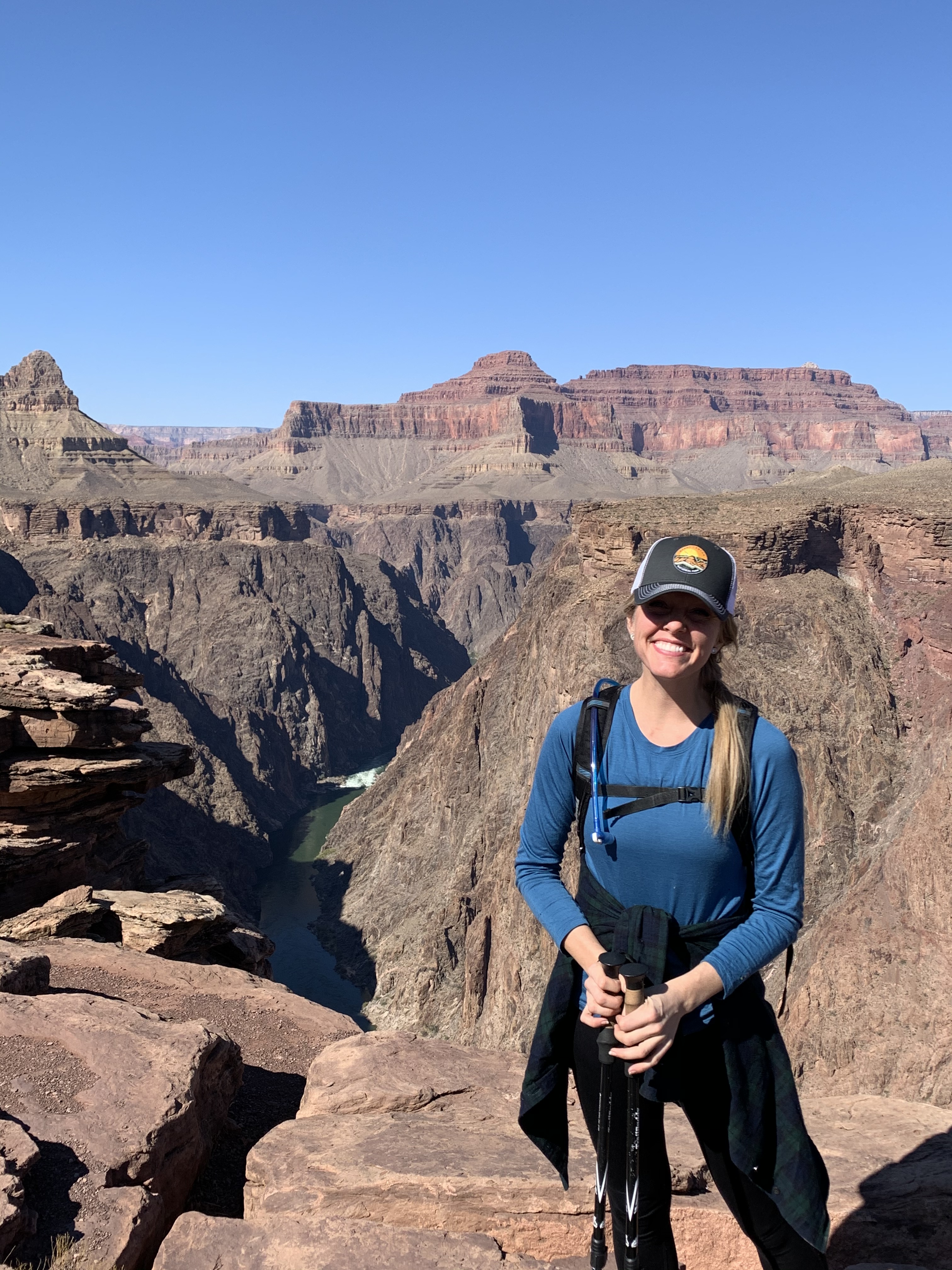 After another 1.5 mile hike, I see a short descent to an overlook. I inch carefully forward along an edge and am taken aback by what I see. Layered rocks give way to a drop-off, the base of which contains the coursing, surging, strikingly teal Colorado River. I can hear the rapids from where I stand, just under 1500 feet above the river surface. I am one of two travelers here at this moment in time. A man stands on the overlook, photographing the incredible scene. We exchange pleasantries, introduce ourselves, and I learn that Luke from Hawaii used to work in this very park. He shares about his travels this year, his time working in the Grand Canyon as a younger man, and his favorite trails and memories from the park. Soon after, the friendly foursome I had encountered earlier in the morning (who also had encountered Luke along the way) arrive. They are from Tennessee and have been road-tripping from Denver through multiple National Parks in Utah and now the Grand Canyon before returning back to Denver for their ride home. We space out on the giant boulders overlooking the river and share a meal, excited and delighted to have reached the day’s destination. Refueling will be important for the return journey – We’ve got what feel like mountains to climb. Emboldened squirrels inch toward us in attempts to sneak our food, and I learn that squirrel bites are among the most commonly reported injuries in the park. I close and stow my trail mix, giggling as I watch the squirrels jump to and fro between us. I am grateful to share these moments, even with strangers, who quickly feel like friends.