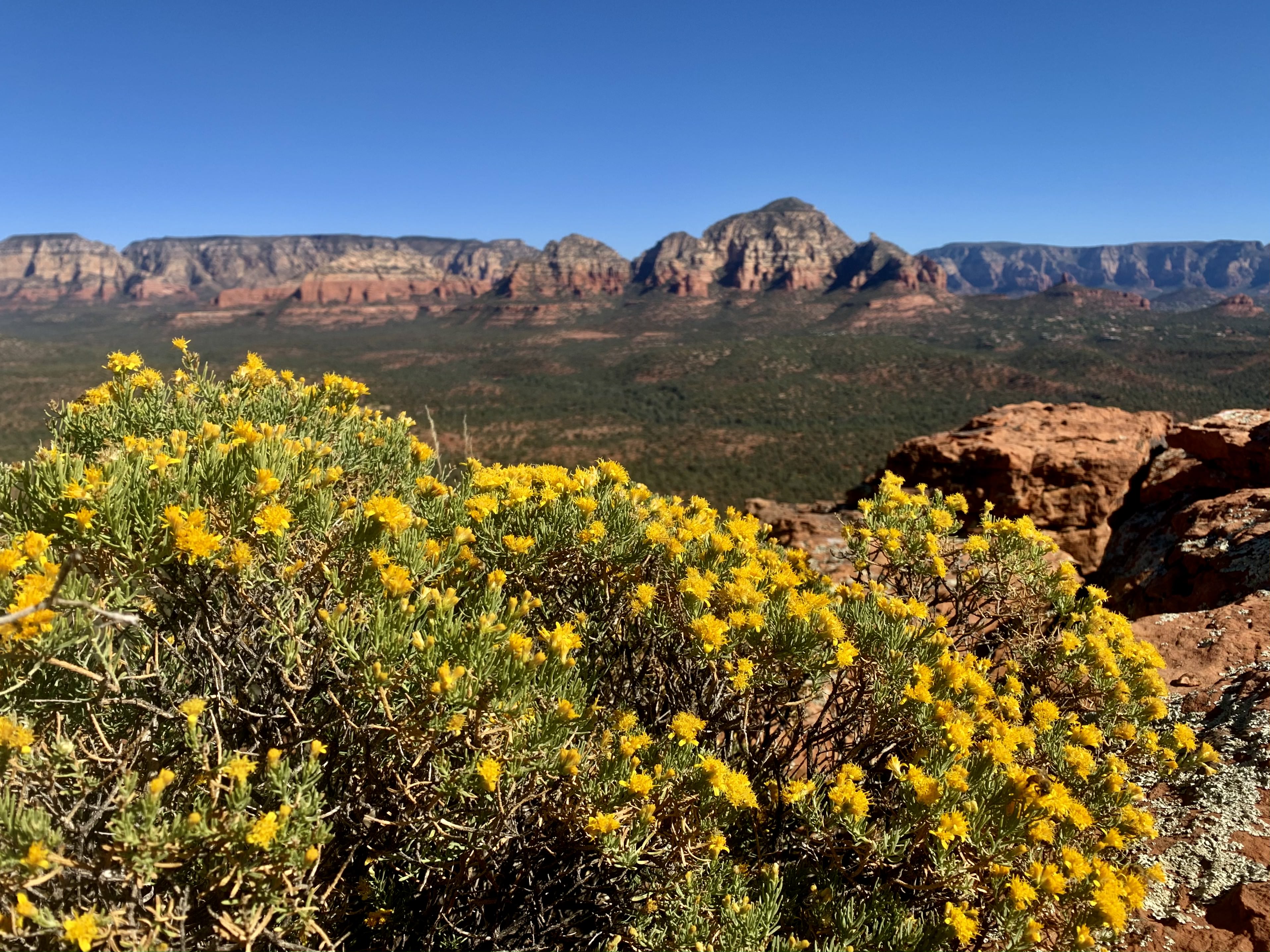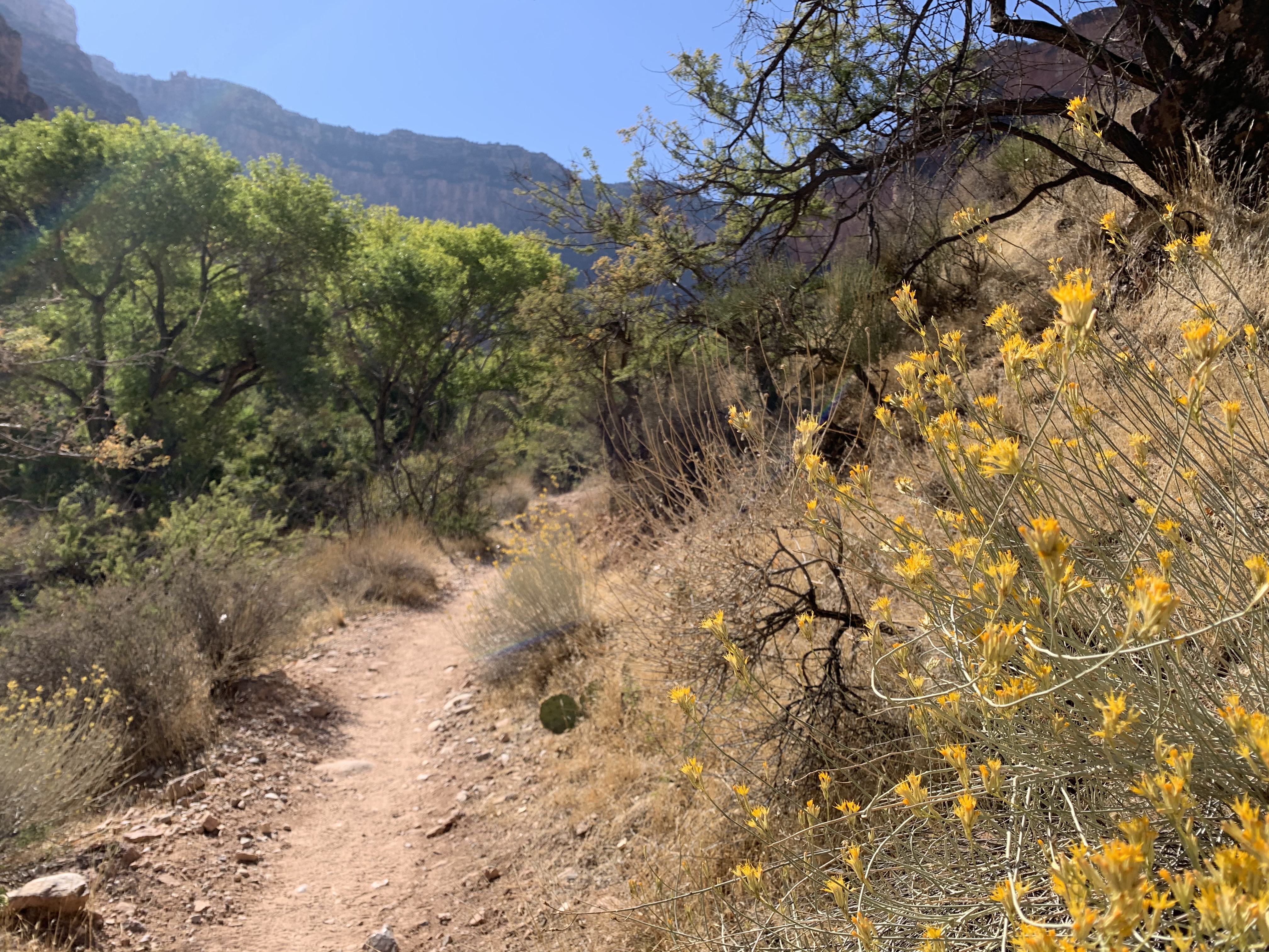 The climate has changed completely from where I began on the rim in the morning. I am on a flatland at around 3800 feet of elevation, compared to the approximate 6800 feet of elevation that I came from just a couple of short hours ago. The weather is warm, in the mid to high 60s, and I am now in a tank top, having removed my long-sleeved wool baselayer, fleece button up, and puffy coat. I see orange sand and spiky flora interspersed with bright yellow flowers all around on the ground. Tiny, agile, terra cotta-colored geckos cross the path at interim, scurrying about their day. Ahead of me, rising, rusted peaks appear to grow in size as I work my way toward them. The canyon walls behind me shrink smaller in kind. I cannot believe I am here.