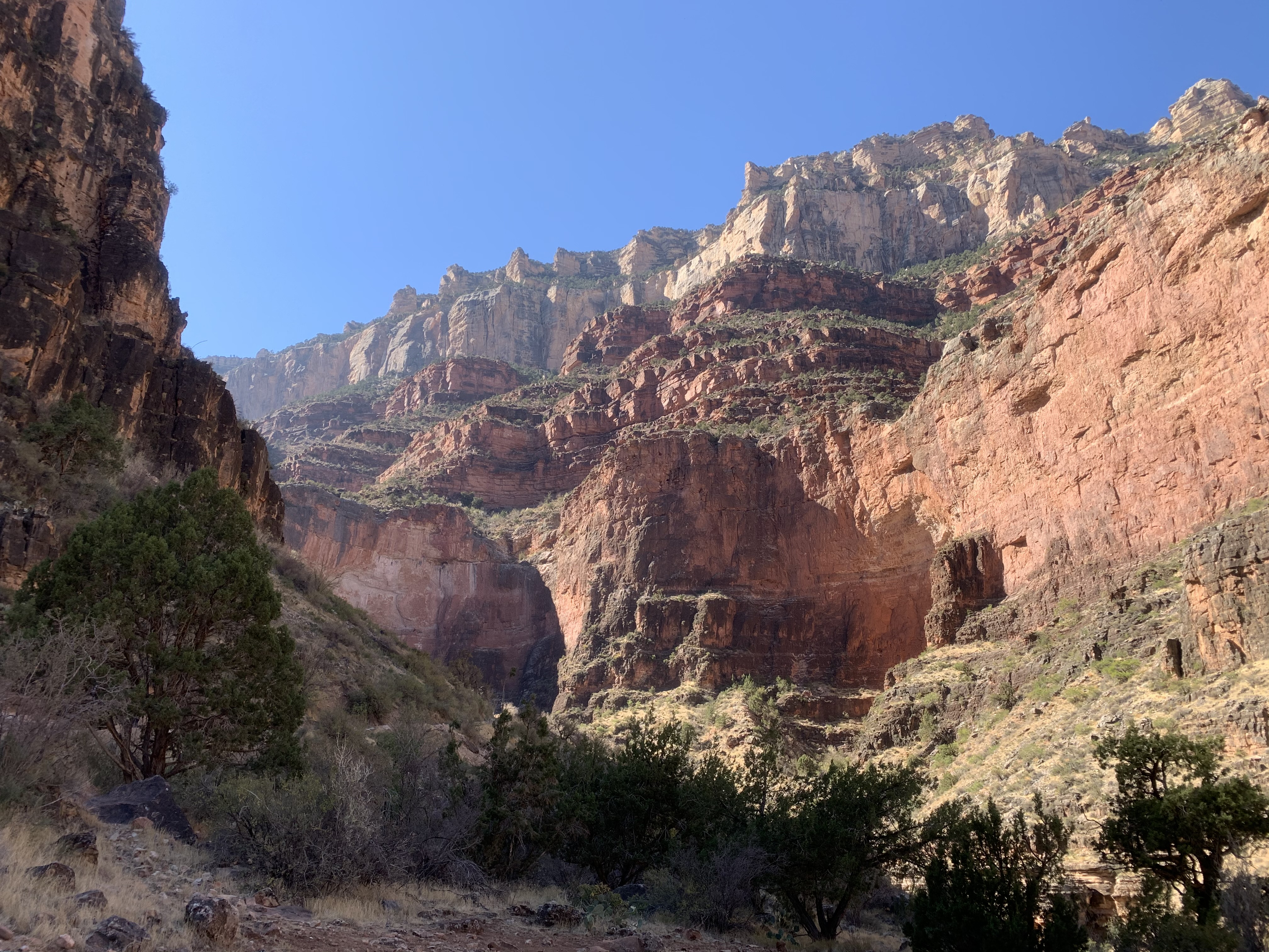 There are blessed rest stops at approximate 1.5-mile intervals along Bright Angel Trail. I pass the first, determined to stay in rhythm. At this point, hikers who had camped at the river during days prior are making their way up canyon. Everyone is kind. Everyone is supportive and encouraging. Everyone appreciates and respects this nature space so deeply. What a sweet gift it is to take part in this community.