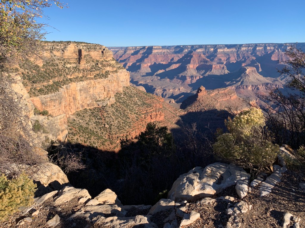 Looking at the time, I discover I have about 4 hours until I can check in to the hotel. Shuttle buses run like clockwork east and west from the Market to impactful viewpoints along the South Rim of the canyon, and I choose one heading eastward to the South Kaibab Trailhead, ready and excited to explore in closer detail.