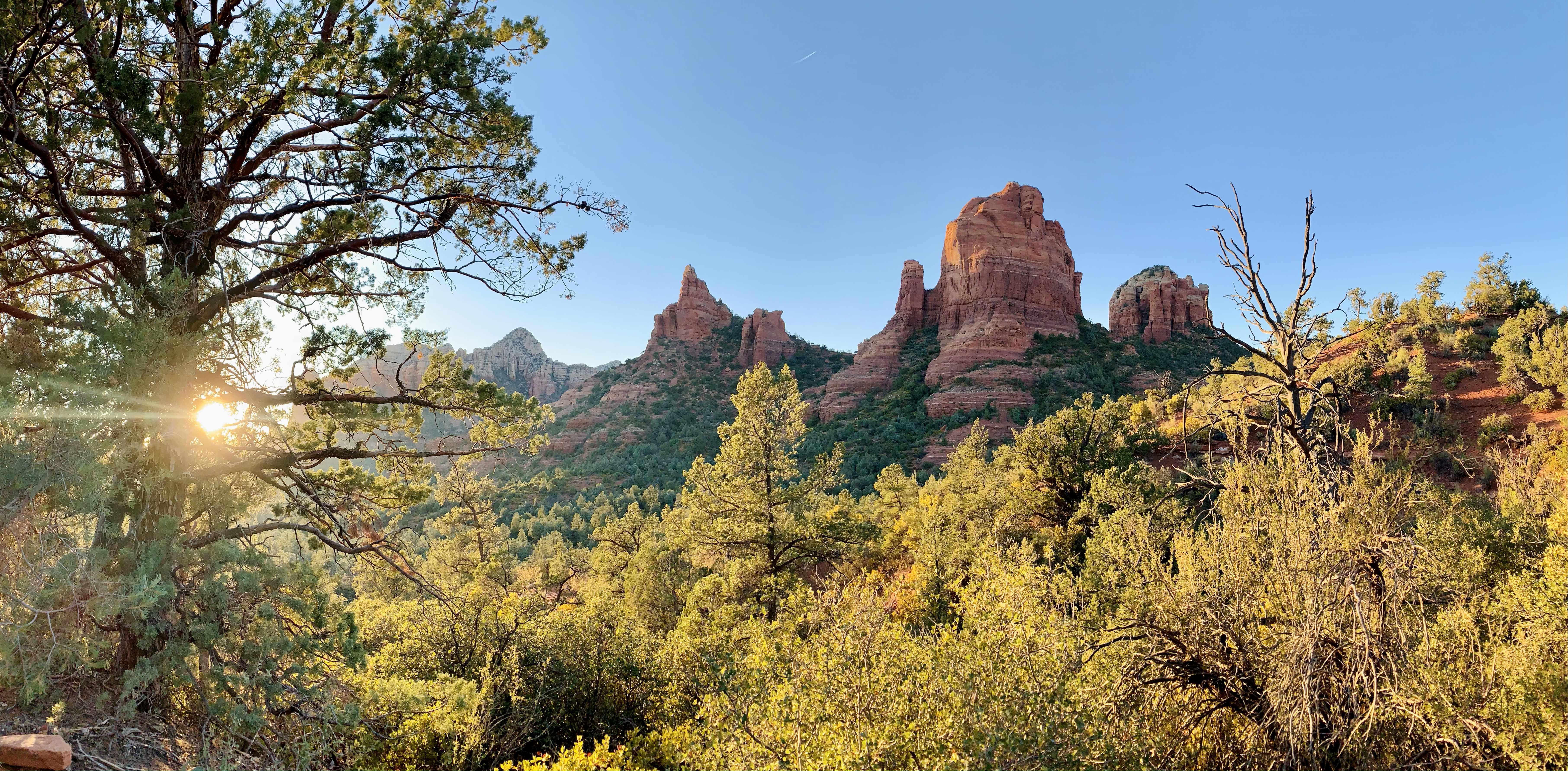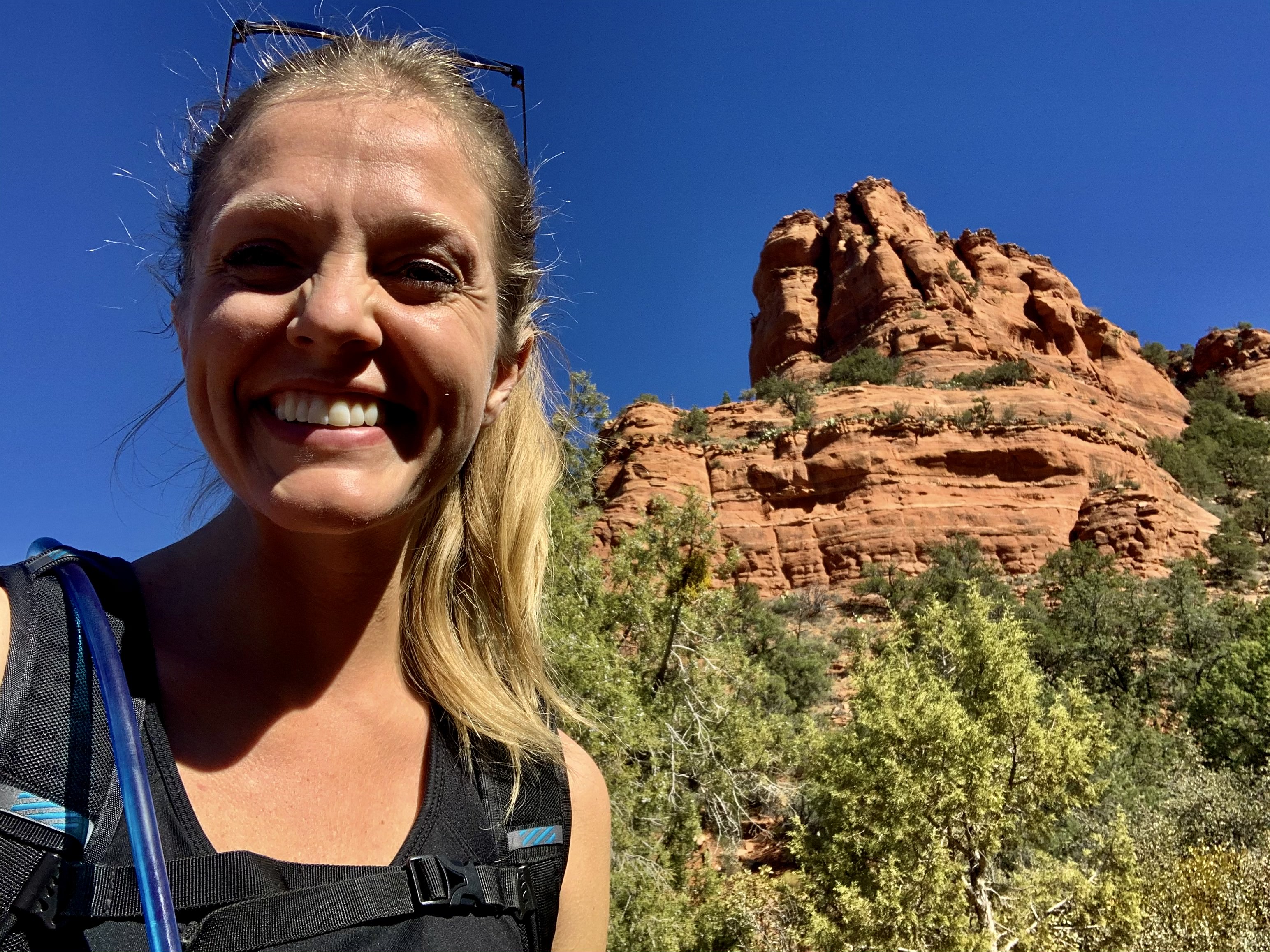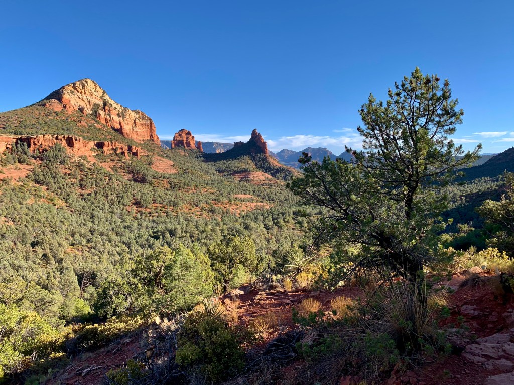 We part ways along the trail and I keep climbing. It looks like around half of the hike upward remains. I pause on an overlook and turn around, to get a sense of how much trail lies behind me. I breathe deeply. The sun rises warmly over Sedona, lighting up its towers in a bright orange-gold. The blue sky contrasts in stunning fashion with the rocky columns. Greens look greener. Cactus spikes are well-defined. Cacti! We certainly don’t have these in Minnesota! I see my car in the trailhead lot, a speck. I feel content, at peace, alive.