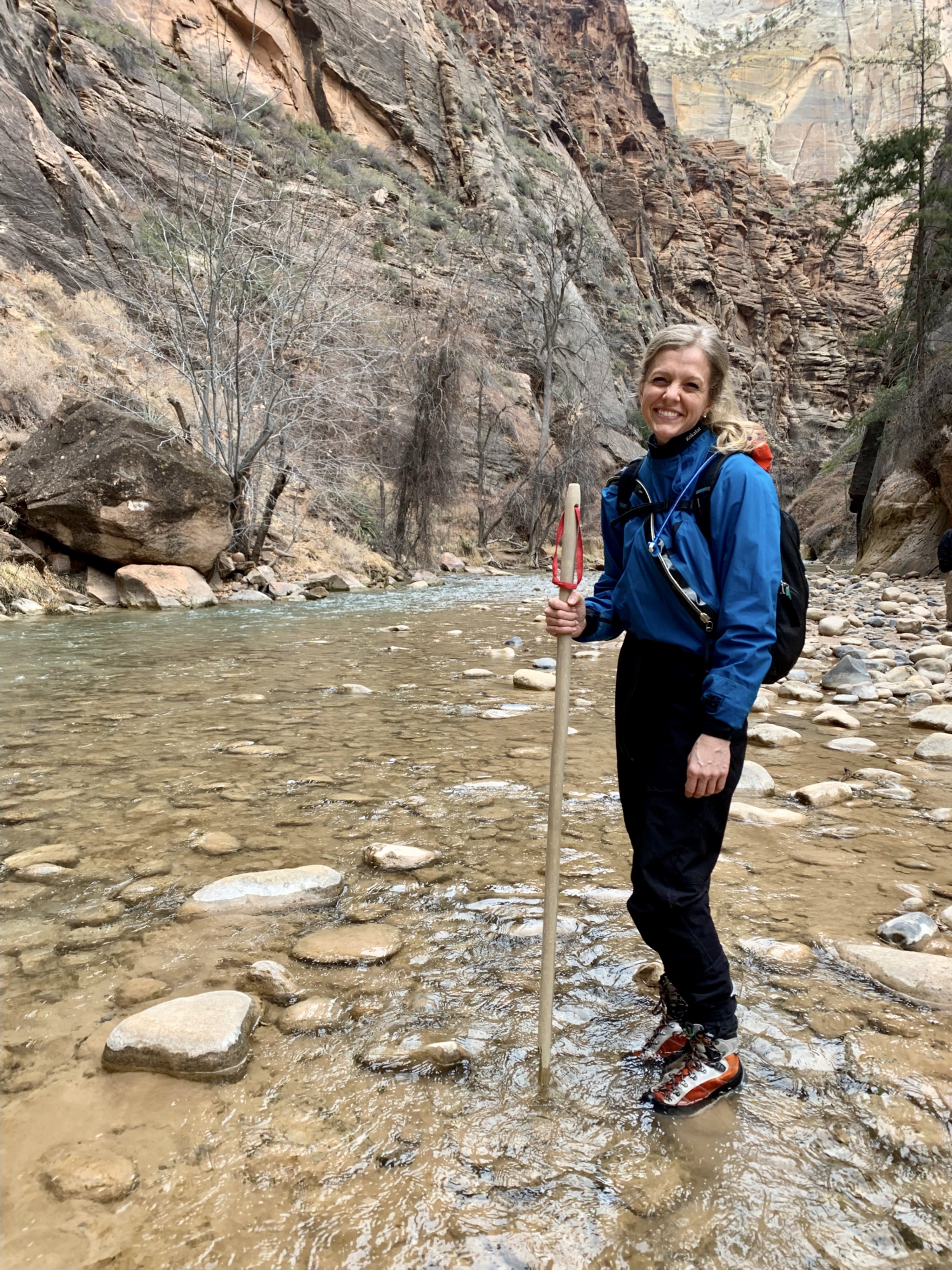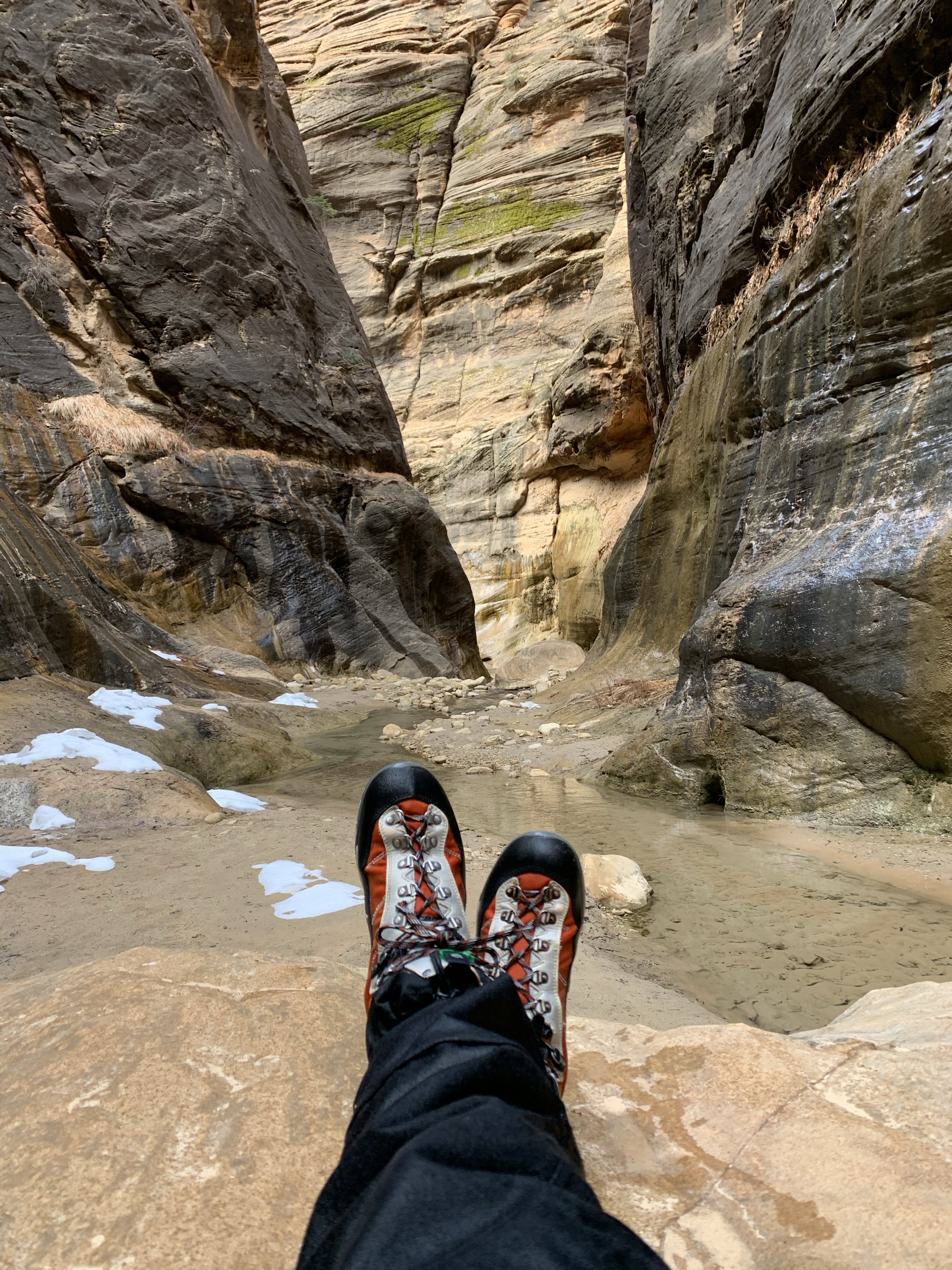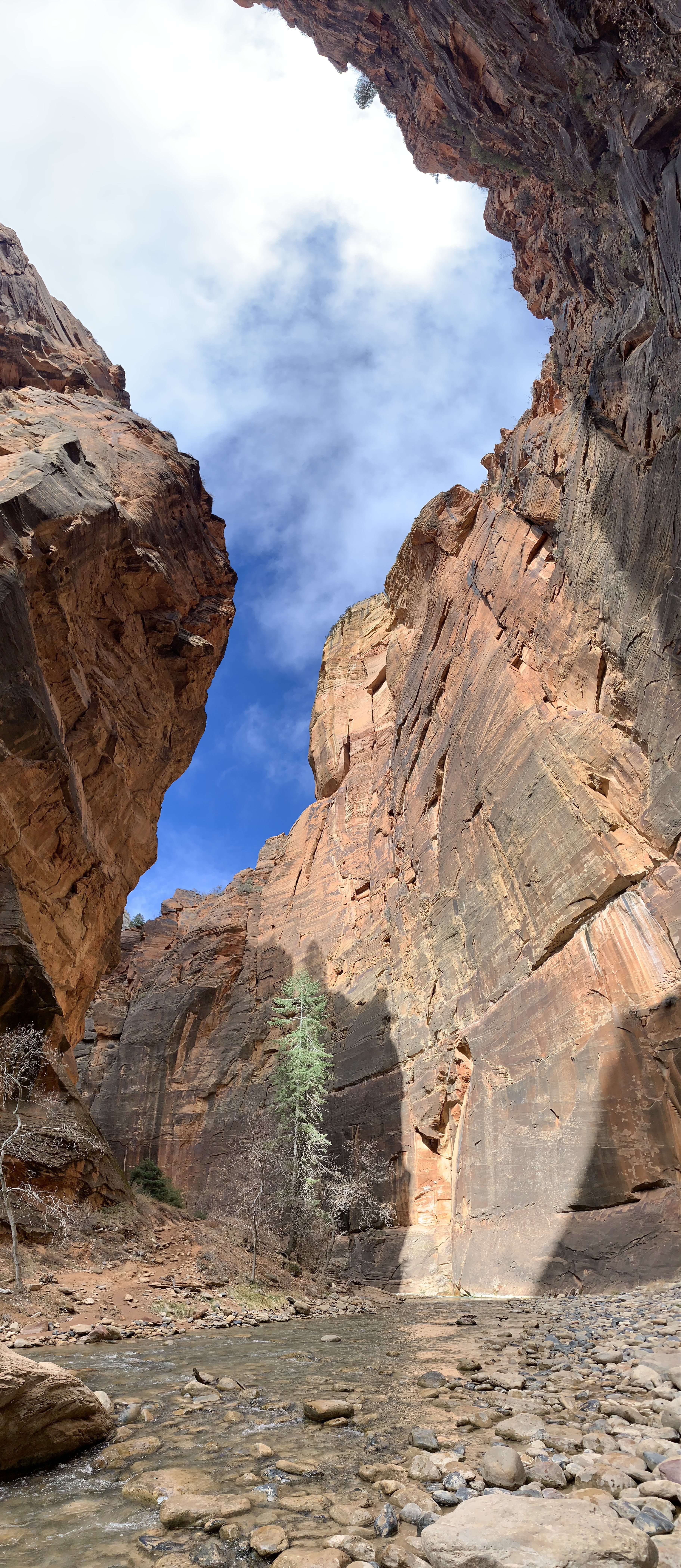 The day started at Zion Adventure Company, one of the multiple enterprises in Springdale – the sweet town just adjacent to Zion’s west most park entrance – offering rental gear for hiking the Narrows (along with many other excursions). Within the store, a screen sharing today’s weather and current conditions near the river, both reporting optimal conditions. The store itself had a light trickle of travelers passing through for gear; far fewer, I’m sure, than in the summertime. Helpful staff recommended a dry suit, lined with rubber gaskets, along with neoprene socks and boots and a walking stick – all to protect from the cold, rocky river trail. I rented the whole package and drove the short distance to the parking lot for the Riverside Walk – a short, paved hiking trail lining the Virgin River to the Temple of Sinawava, the point where river access begins.