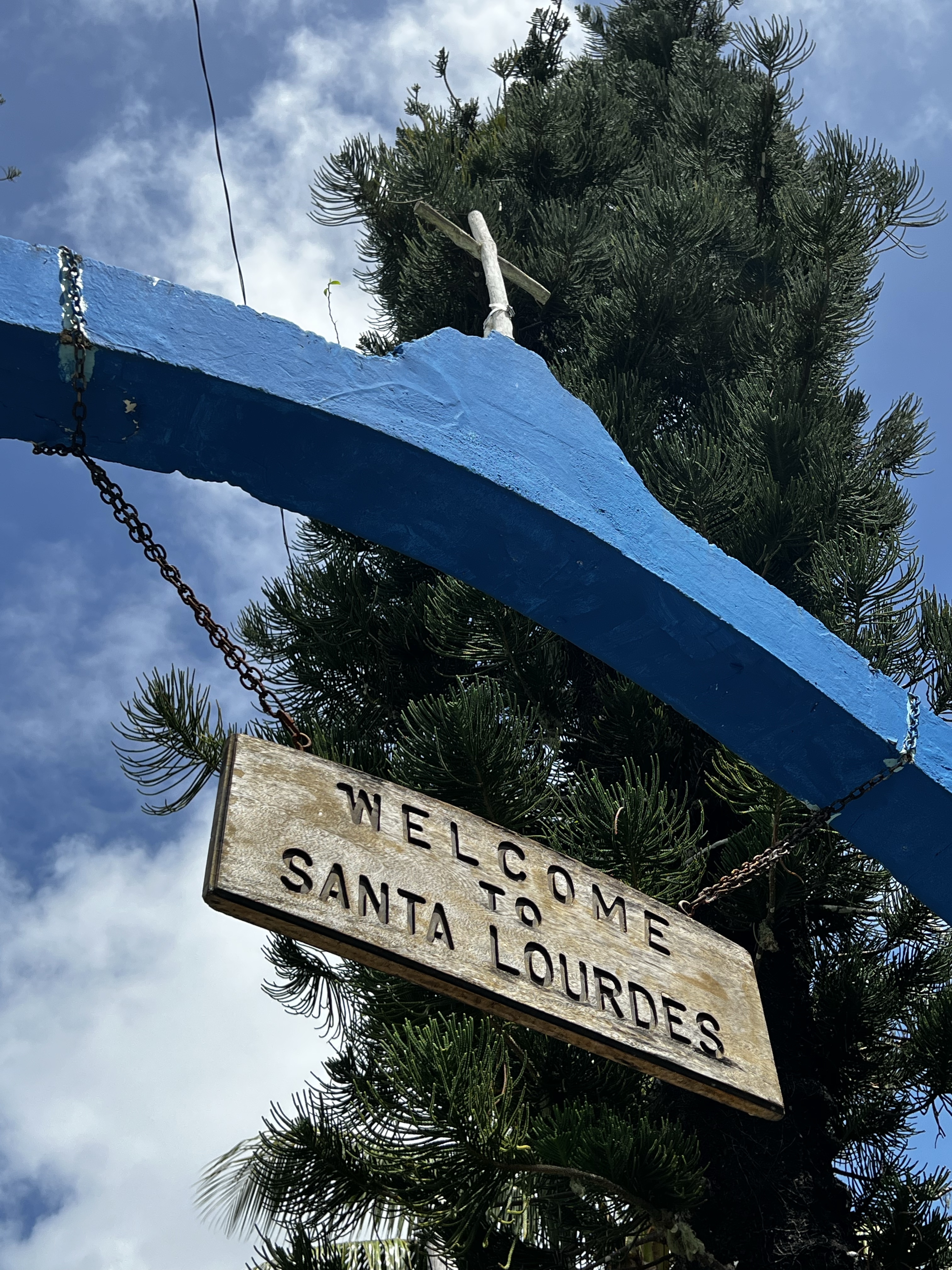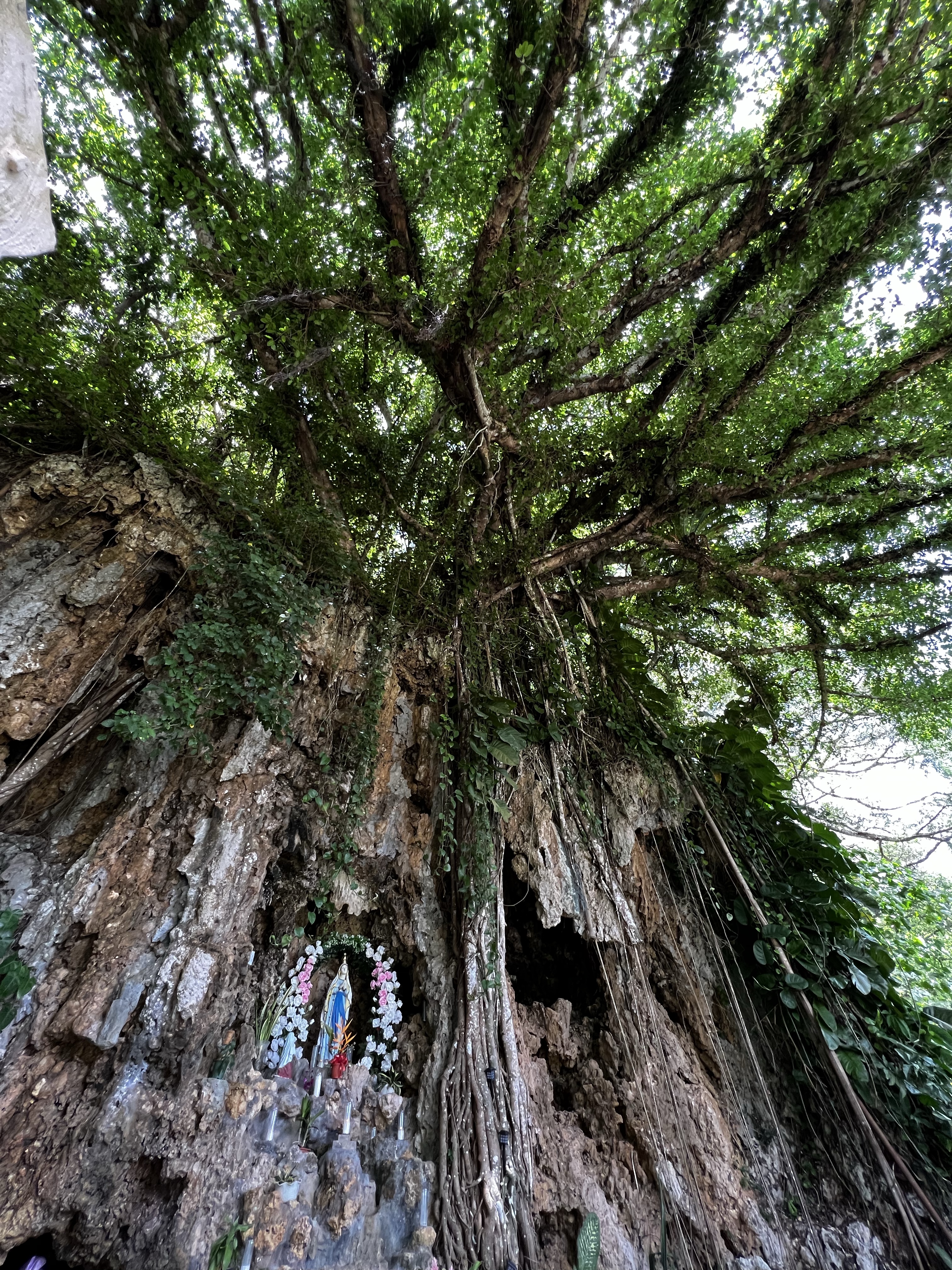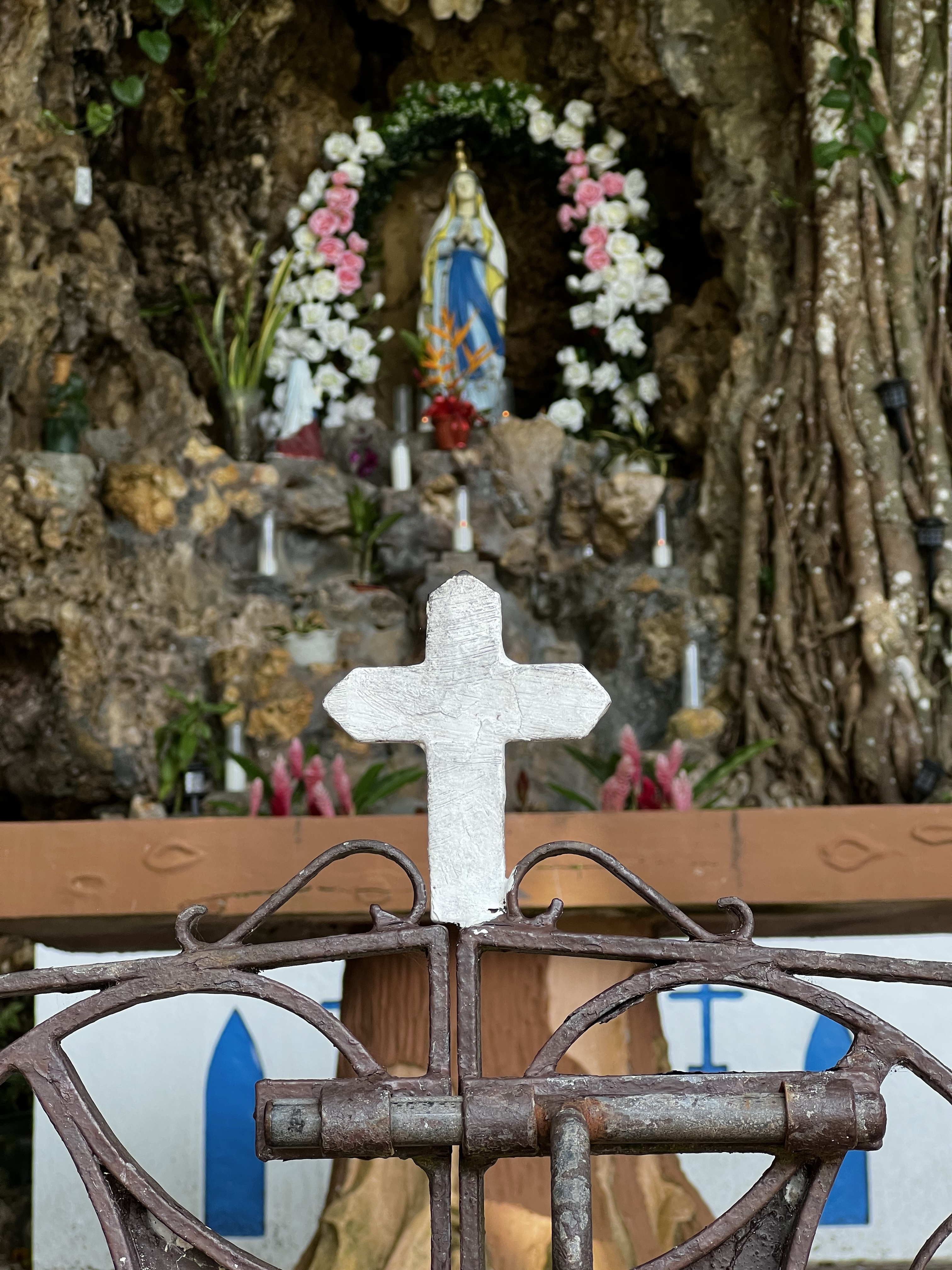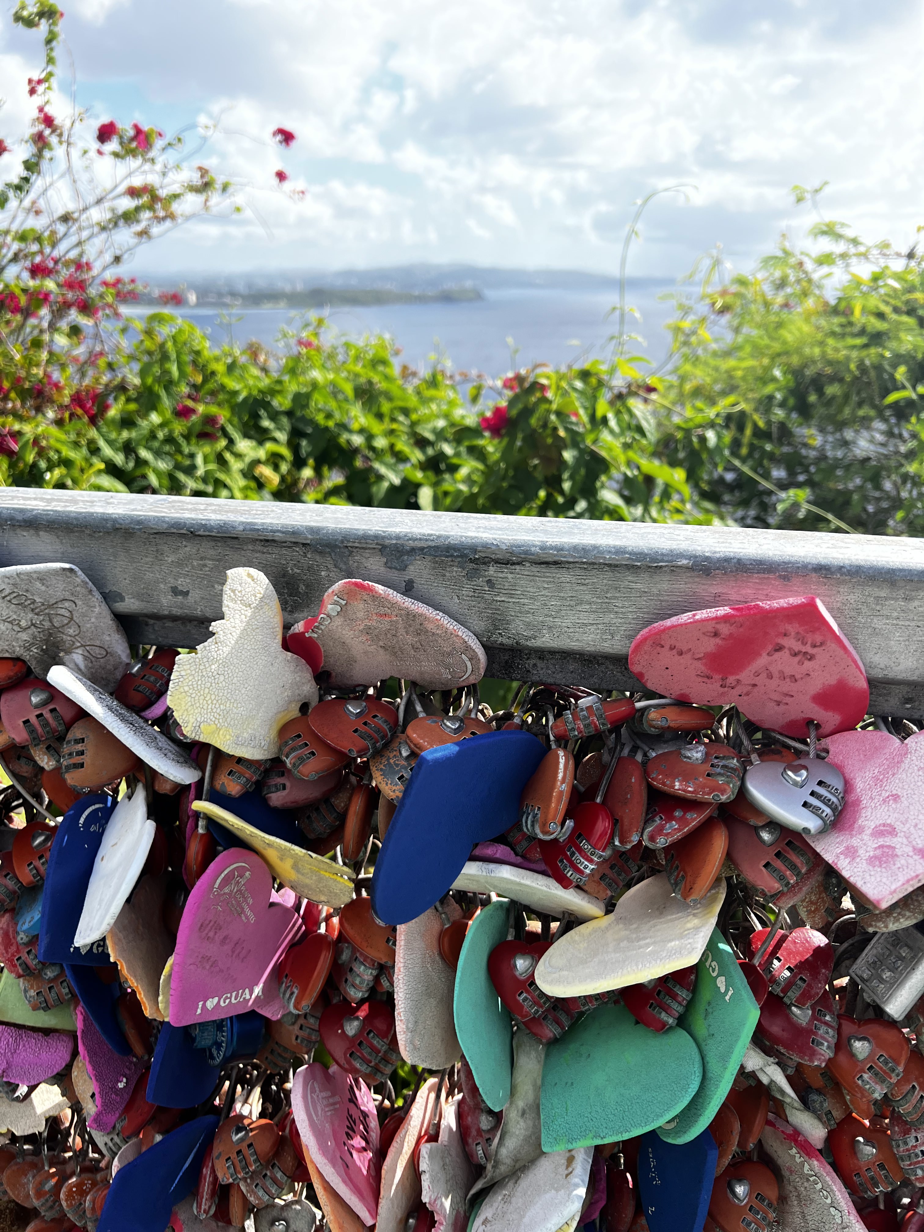 – Puntan des Amares (“Two Lovers Point”) is a cliff top overlooking Tumon Bay where, by ancient story, two lovers forbidden from being together jumped to their deaths rather than being separated by familial and cultural tensions and expectations. Fences around the perimeter of the monument here are lined with heart-shaped locks placed by lovers who travel from every curve of the globe, commemorating their devotion to each other. As you look out over the bay, you can see the profile of a man’s face in the contour of the beach and of a woman’s face in the contour of the cliff (see the third and fourth photos below) – the two lovers forever present together here!