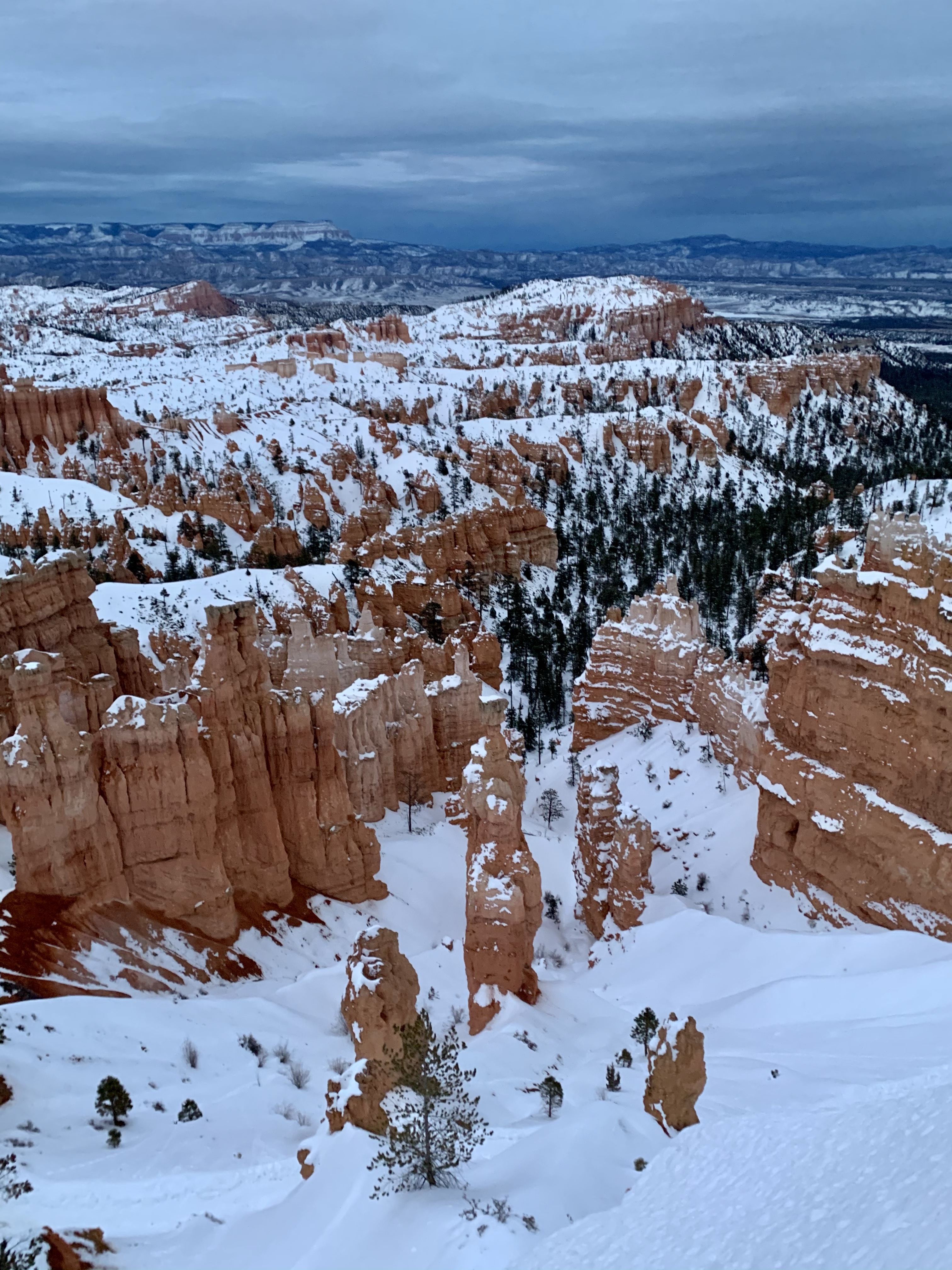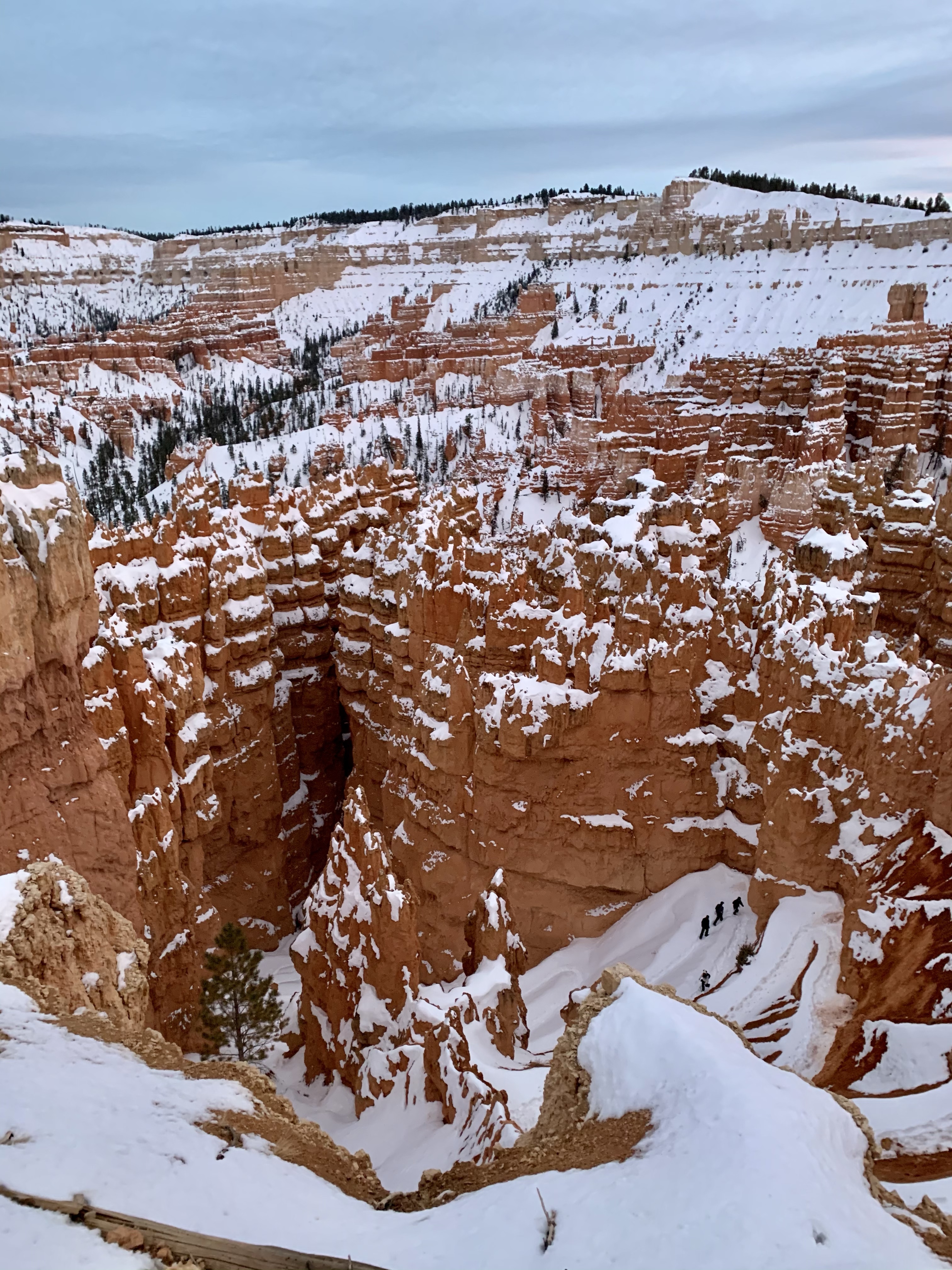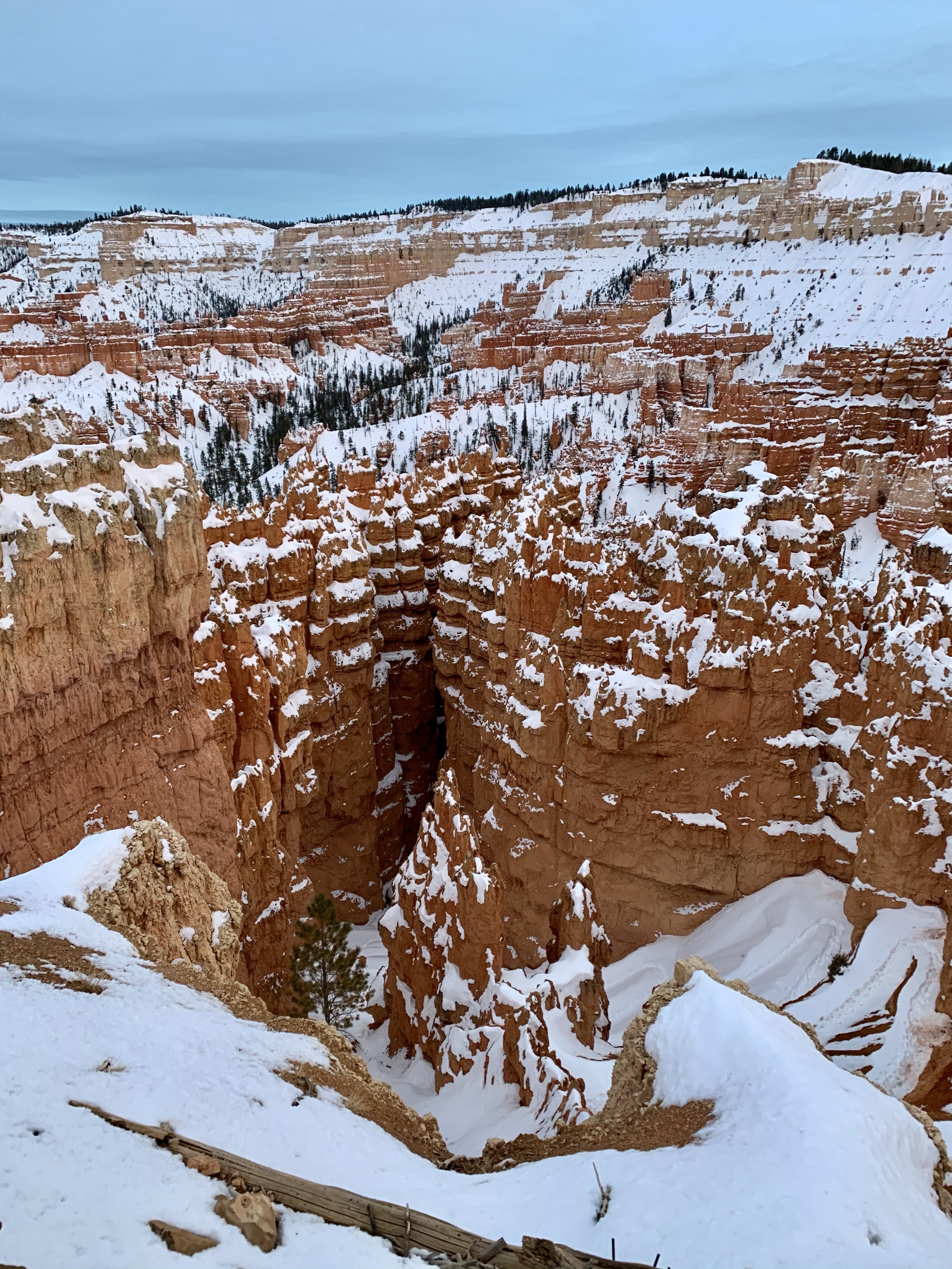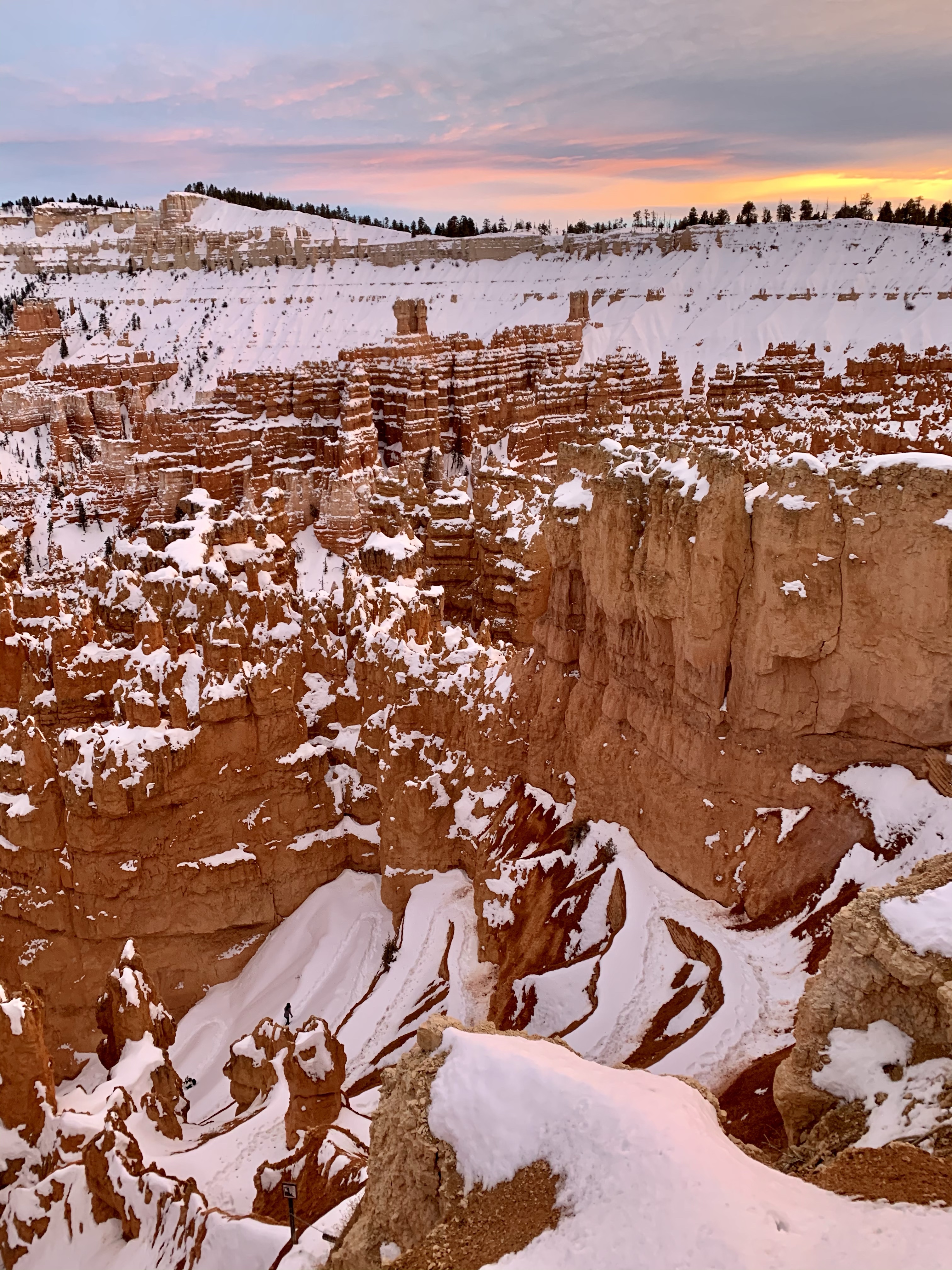 Today In Brief: A short collection from an enchanting hike among the hoodoos of Bryce Canyon National Park. This stunning trail began at Sunrise Point and descended steadily down into Queens Garden Trail, whereafter it looped south and then west up to the switchbacks of the iconic Wall Street. Ending at Sunset Point, the sun fell to the horizon behind me and lit the rocky beauties in gold and pink. A quiet photographer perched at Sunset Point, capturing the scene with a high-powered lens. An older woman enjoying the view shared that this was the exact point where her parents met. We three watched together as the lighting shifted over the canyon. As dusk gave way to night, we dispersed along the icy Rim Trail toward our respective cars, enthralled, at peace, happy-hearted.